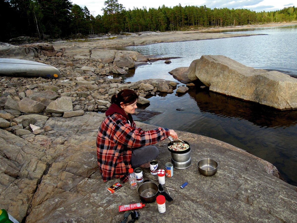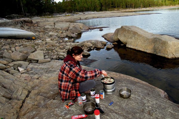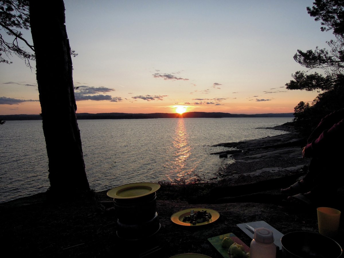 Beim auspacken des Kochers stellten wir leider fest, dass er nicht richtig verschlossen war und Beutel nebst Kochgeschirr vor Spiritus trieften, weshalb wir das Ganze sicherheitshalber erstmal direkt am Wasser aufbauten. Dort bereiteten wir die extrem leckere Terence Hill Pfanne nach Rezept aus dem Outdoor Kochbuch. Und überhaupt: Die Zusammenstellung des Proviants war großartig. Wir wussten gar nicht wann wir das jemals alles essen sollten, haben uns aber alle Mühe gegeben uns in den nächsten Tagen die Bäuche voll zu schlagen um möglichst schnell das Gewicht des Proviantgepäcks zu reduzieren :-)