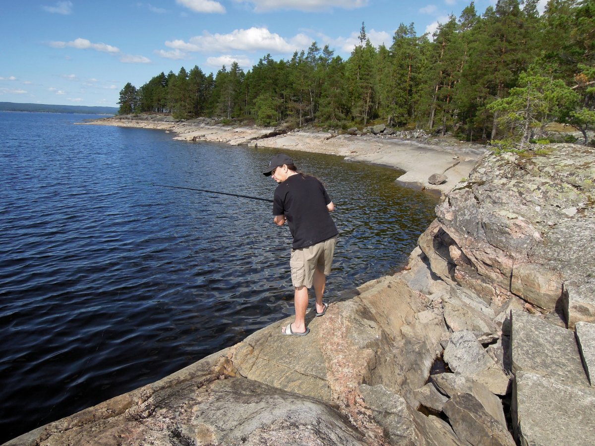 Das Angelglück hingegen war uns nur am zweiten Tag hold, als uns nach nur wenigen Minuten zwar noch ein etwas größerer Brocken vom Haken glitt, später dann aber zumindest ein ausgewachsener Flußbarsch an Land gezogen werden konnte, welcher in Salz eingelegt und mit Alufolie umwickelt am Abend auf dem Grillrost landete.