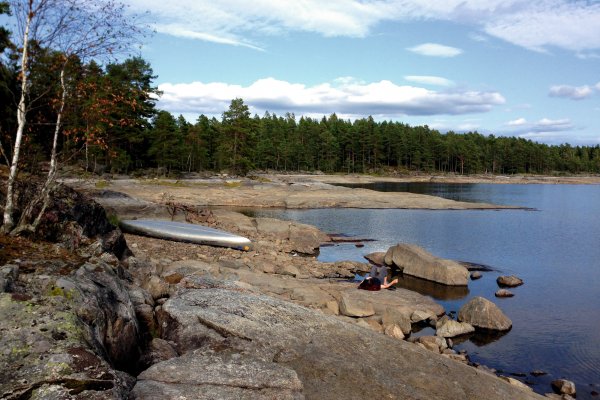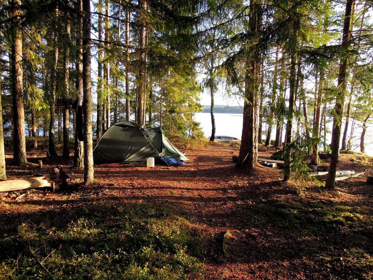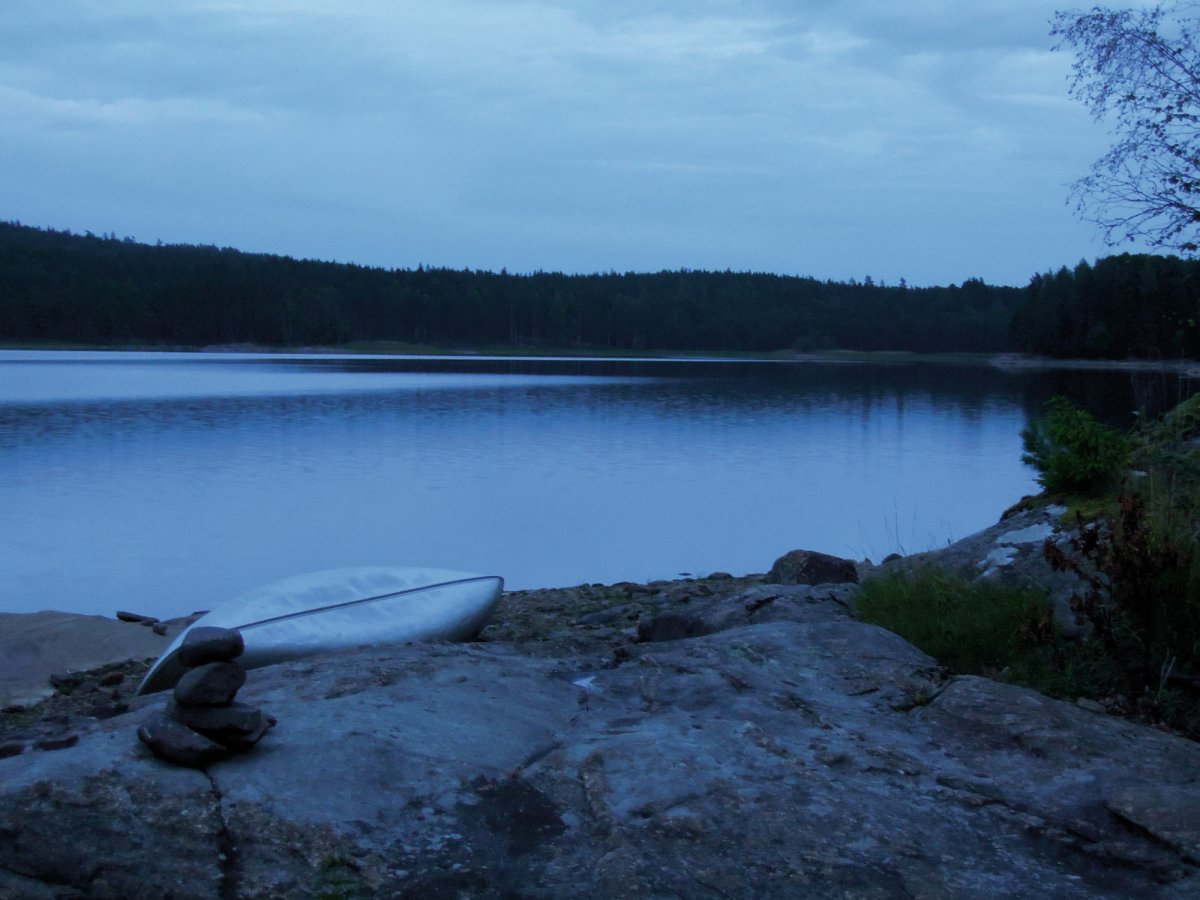 Als die Kräfte langsam schwanden (schließlich waren wir mit Anfahrt schon gut 18h unterwegs), überquerten wir noch eine letzte, recht offene und wellenreiche Bucht - und fanden unseren ersten Rastplatz ca. 7,5km von Lennartsfort auf einer kleinen Landzunge am Ostufer des Foxen. Das Zelt war schnell aufgebaut - und ein letztes mal an diesem Tag hieß es Gepäck und Equipment entladen und zum Zelt tragen.