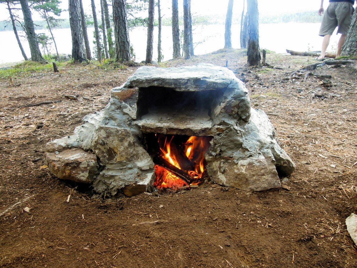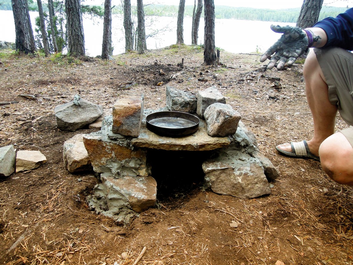 Also schleppten wir die nächsten 1-2 Stunden Stein um Stein - und vor allem Eimer um Eimer aus der gut 50 Meter entfernten Lehmquelle über das felsige Gelände zu unserem Rastplatz. Am Ende waren es 5-6 volle 10 Liter Eimer. Mit der Freude eines Kleinkindes verkleideten und verschmierten wir die Steine der mittlerweile aufgeschichteten Brennkammer. Wir legten die erste Steinplatte drauf und begannen dann darauf die Backkammer aus Steinen aufzustellen, gerade groß genug, damit die Pfanne aus dem Kochgeschirr reinpasst - und diese ebenfalls mit Lehm abzudichten und jede Fuge zu verschmieren. Eine große Steinplatte oben drauf - und sogar zwei Passende Steine zum verschließen der Öffnungen wurden gefunden. Der restliche Lehm wurde mit weiteren Steinen sogar noch zu einer zweiten Wand rund um die Brennkammer verarbeitet. Quasi ein Doppelwandiger Backofen, der seine ganze Wärme in die Backkammer abgab.