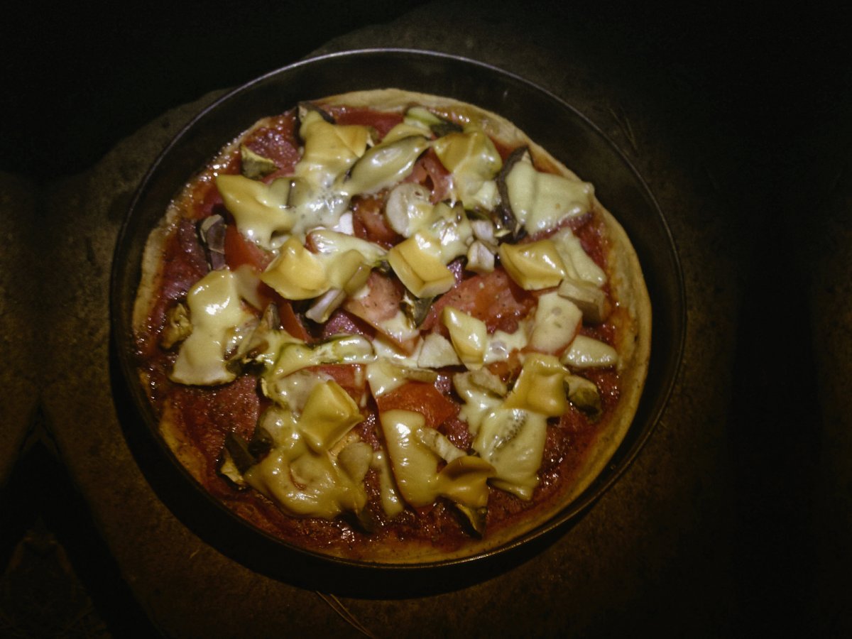 Keiner von uns hat jemals zuvor so etwas gebaut - aber was soll ich sagen: Es funktionierte! Wir heizten in der unteren Kammer ordentlich ein. Nachdem das Holzes verbrannt und zu einem großen glühenden Haufen geworden war, legten wir den passenden Stein als Ofenluke davor - und schoben den mittlerweile in der Pfanne angerichteten und lecker mit passierte Tomaten, Pilzen, Salami und Käse belegten Pizzateig in die über dem Glutfach liegende Kammer - welche wir ebenfalls mit dem passenden Stein verschlossen. Nach 30 bis 40 Minuten war es dann soweit. Wir genossen unsere erste in einem selbstgebauten Ofen gebackene Pizza - und schoben glatt noch eine zweite hinterher. Wir platzten vor Stolz über unser Bauwerk und hoffen sehr, dass der Ofen im nächsten Jahr noch da steht. Schließlich wollen wir dann mal einen Kuchen backen. :)