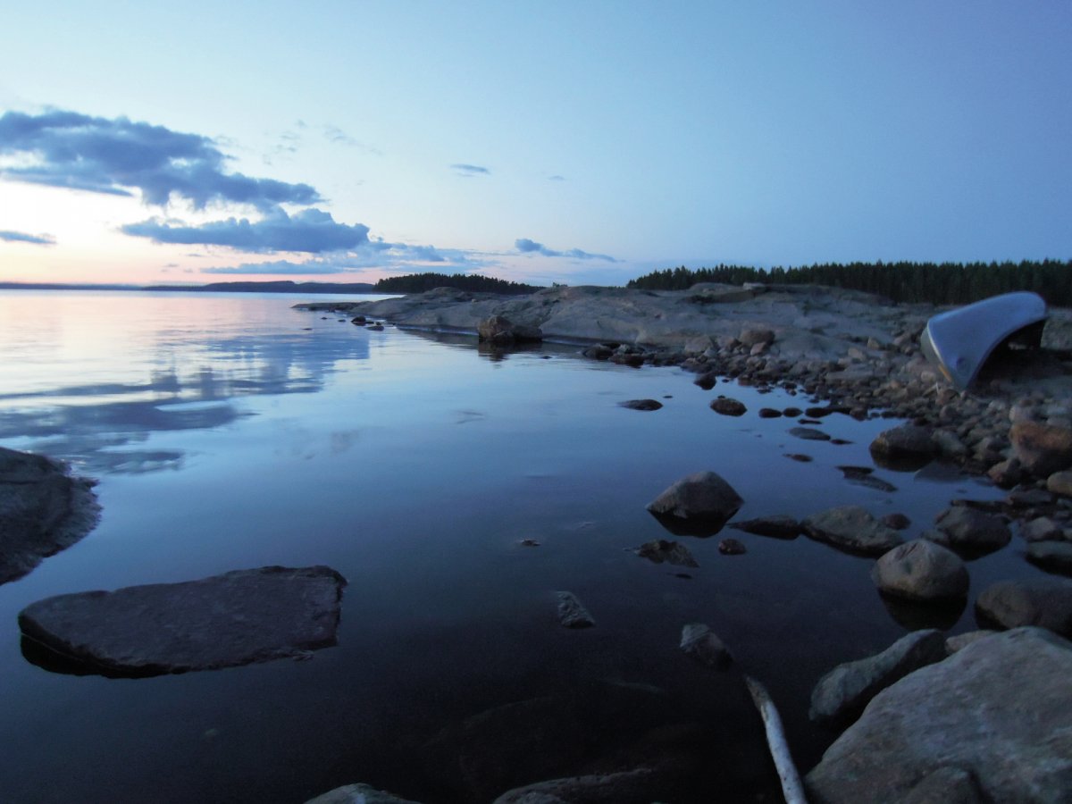 So vergingen die Tage wie im Fluge. Wir erkundeten noch einige Seitenarme und traumhafte Buchten am südöstlichen Ufer des Foxens und sollten am letzten Tag nochmal mit sonnig-heißen Badewetter belohnt werden. Um am Samstag vormittag nicht noch von einer beschwerlichen Tour auf einem möglicherweise rauhen und windigem See überrascht zu werden, machten wir uns am Freitag vormittag bereits auf in Richtung Lennartsfort, um den letzten Tag bereits etwas näher am Camp zu rasten. Die Idee hatten offenbar auch andere und so trafen wir an diesem Tag öfter auf belegte Rastplätze. Direkt an der Verengung des Sees zum Basiscamp, ca 2,5km von diesem entfernt, wurden wir schließlich fündig und schlugen unser Lager auf einer wieder einmal traumhaften Landzunge auf, die sogar über eine kleine Badebucht mit Sandstrand verfügte. Wir genossen noch einmal die herrliche Aussicht, die Ruhe und gingen bis zum frühen Abend immer mal wieder Baden. Ein letztes Abendmal läutete die dann erstmals etwas kühlere Nacht ein. So kühl das am Morgen zumindest das Nutella in der Tonne hart war :-)