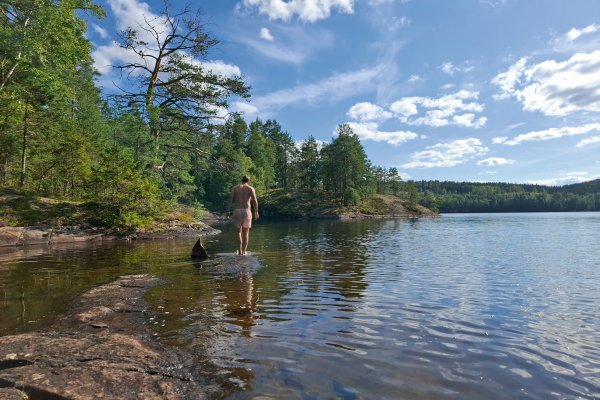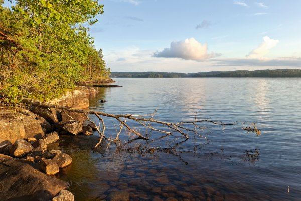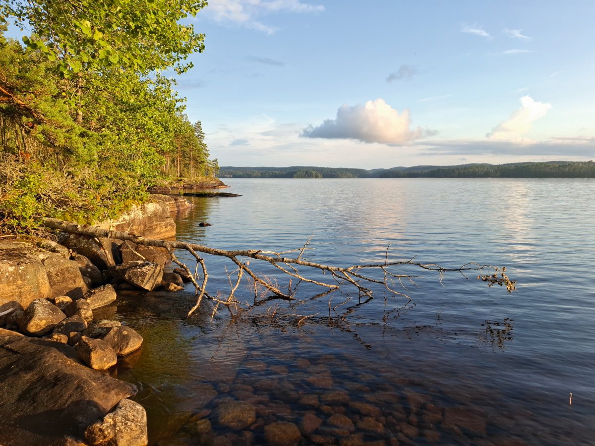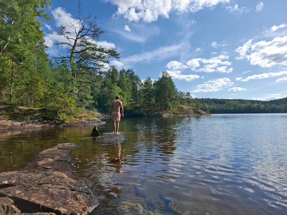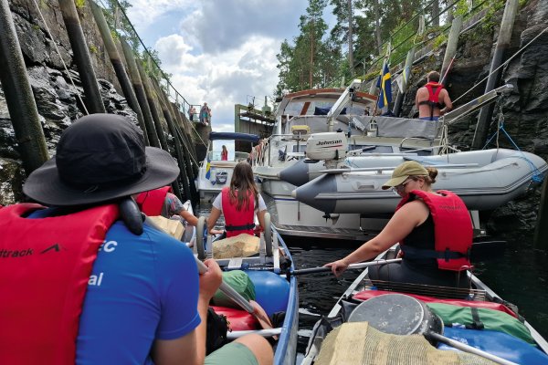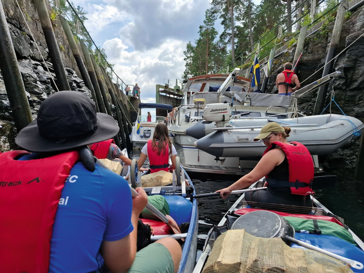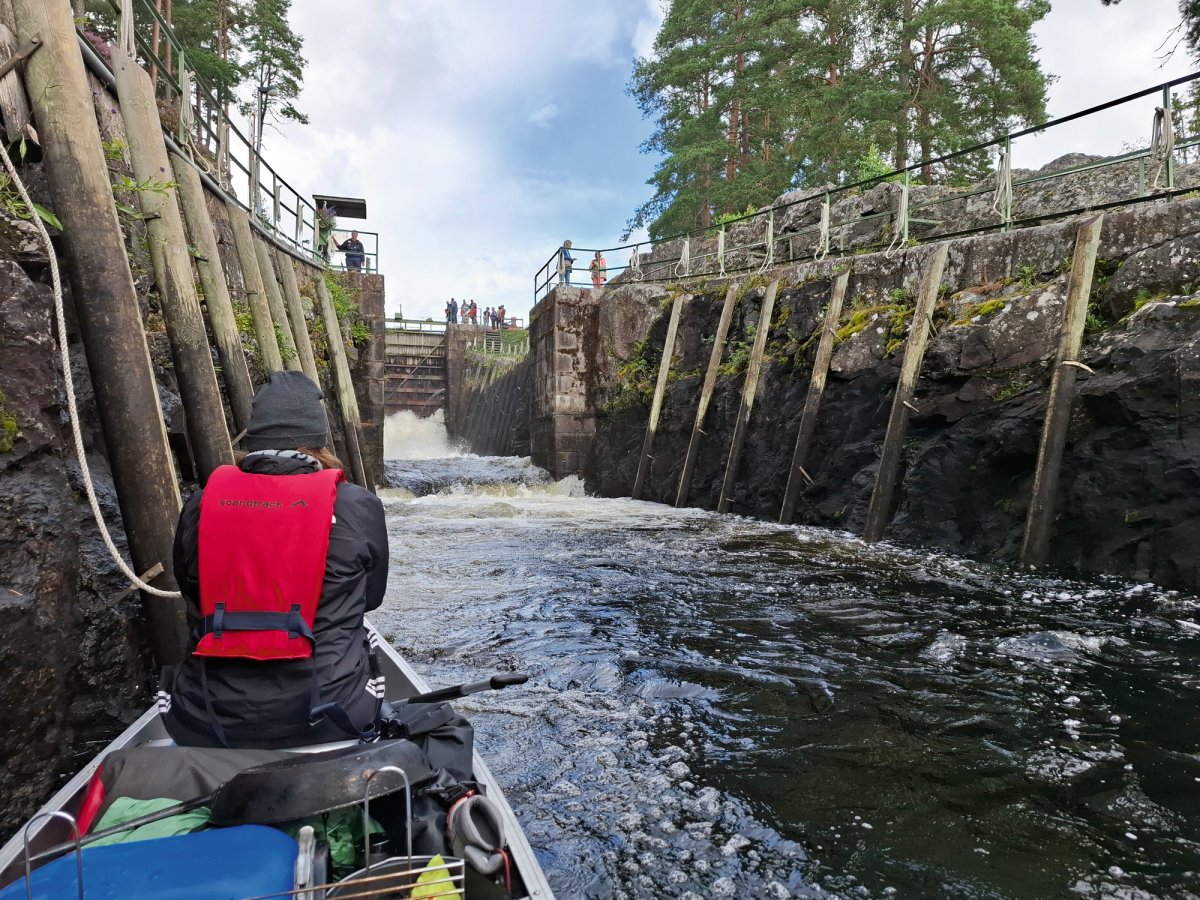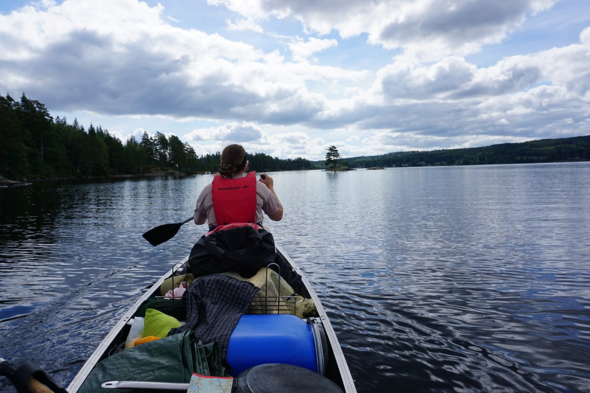 Die ersten Paddelschläge waren voller Aufregung und Vorfreude. Die Landschaft, die sich um uns herum entfaltete, war atemberaubend: dichte Wälder, weitläufige Seen und in der Ferne waren unzählige kleine Inseln zu erkennen, die wie Juwelen in der Sonne funkelten. Es war, als wären wir in ein Märchen eingetaucht. Bereits auf dem ersten Kilometer machten wir eine besondere Erfahrung. Denn um von dem Foxen auf den Lelang zu gelangen, mussten wir eine Schleuse durchqueren. Die Schleuse ist in die Felsen eingesprengt und man fährt zwischen Felswänden durch eine schmale Fahrrinne, ehe man die Schleuse erreicht. Dann werden durch drei Kammern über sieben Meter Höhenunterschied überwunden, was definitiv eine aufregende Erfahrung war. In den nächsten sieben Tagen paddelten wir mehr als 60 Kilometer über den Lelang. Auf der Strecke erlebten wir die Landschaft Schwedens hautnah.