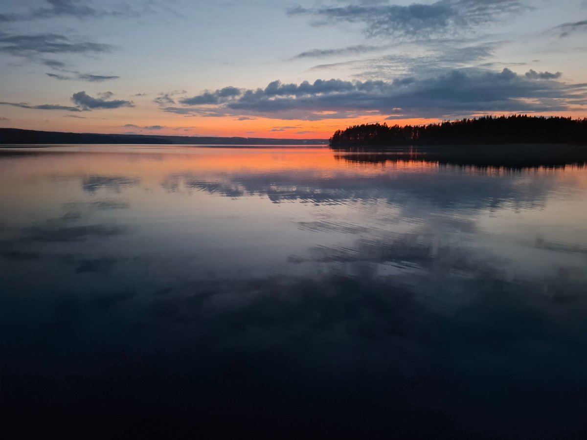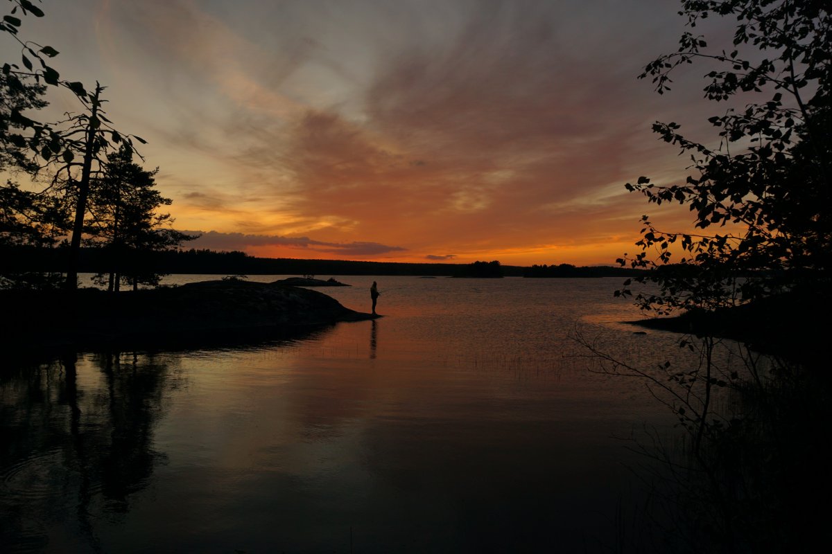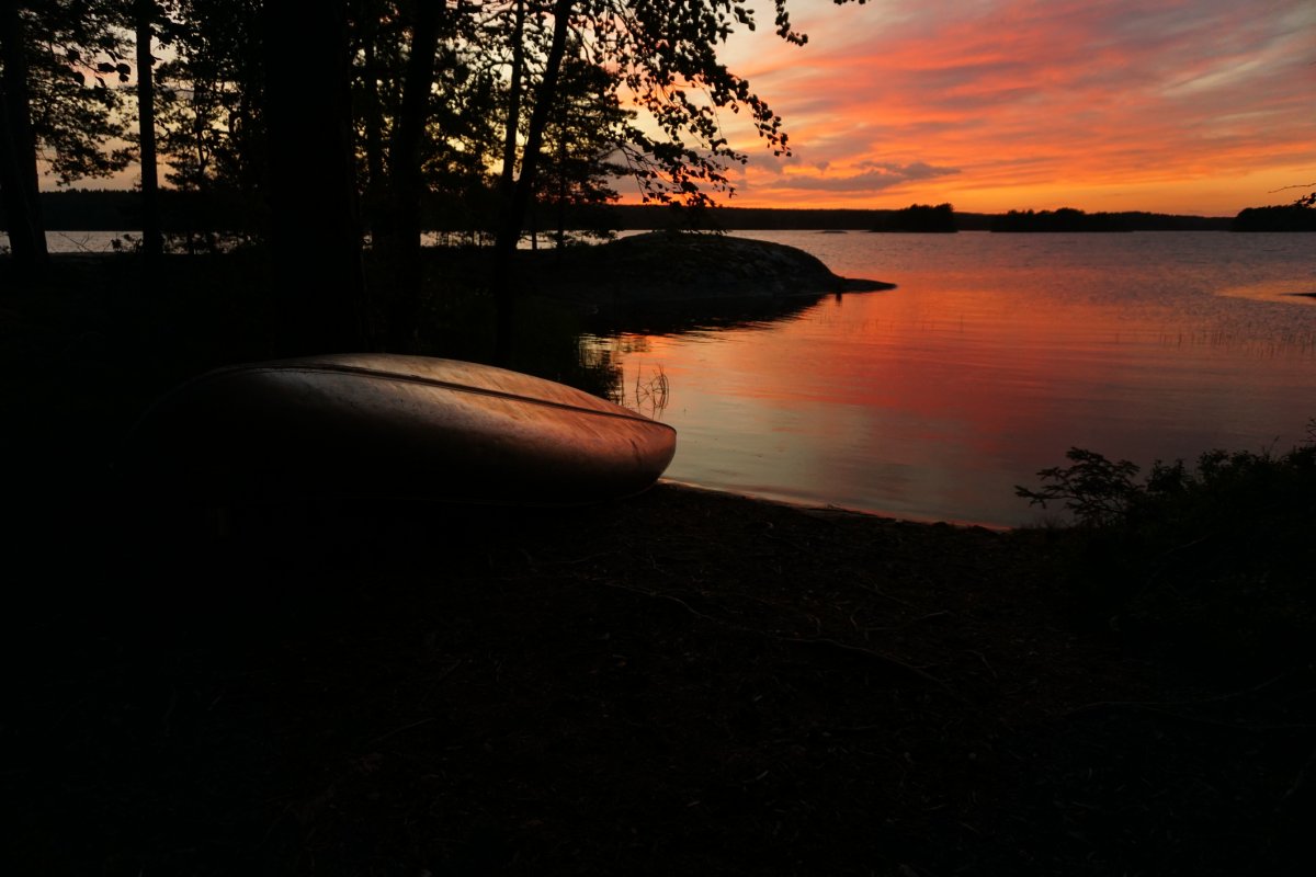 Nach etwa fünf traumhaften Tagen frischte der Wind auf und das Wetter kippte. Da stürmische Böen bis 65 km/h vorhergesagt wurden, entschieden wir uns am fünften Tag eine längere Etappe zu fahren, damit wir flexibel bleiben können, ohne dabei in Gefahr zu geraten. So war es uns möglich an Tag 6 nicht auf das Wasser zu gehen, da wir bereits nah am Outdoorcamp waren. Es regnete viel und es war überaus windig, sodass wir glücklich waren, den Tag im trockenen Zelt und einsam auf einer kleinen Insel zu verbringen. Gegen Abend kam die Sonne noch einmal raus, sodass sich uns ein traumhafter Sonnenuntergang mit vielen Farben bot.