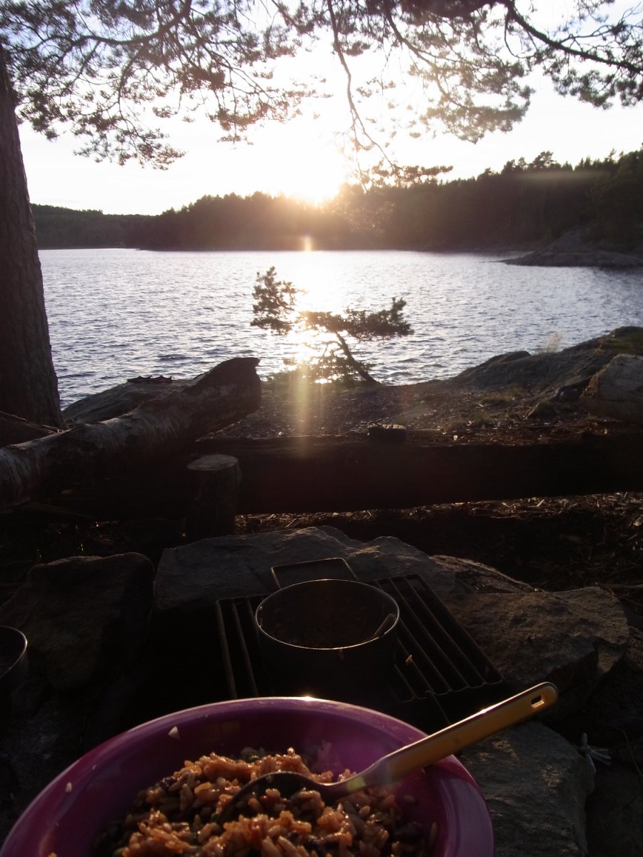Nach dem gemeinsamen Frühstück mit unseren Zeltnachbarn verabschiedeten wir uns und stachen in See. Diesmal lag nur eine kurze Strecke vor uns, etwa 4km zum Dano 14. Dort angekommen richteten wir unsere Lager ein und machten es wetterfest, denn am darauffolgenden Tag kündige sich Dauerregen an. Der Nachmittag gestaltete sich also recht kurzweilig. Als wir dann zufrieden am Lagerfeuer bei Jägerbraten mit Bratkartoffeln, grünen Bohnen und mitgebrachtem Radler saßen, genossen wir einen fantastischen Sonnenuntergang. Nur für diesen Augenblick lohnte sich die ganze Reise. Einfach wundervoll!