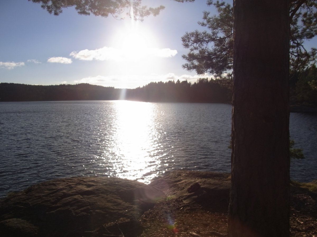 Als wir dann endlich auf dem Wasser waren, hatte sich der Regen immer noch nicht verzogen. Wasser von unten, Wasser von oben, sozusagen. Dafür funktionierte das gemeinsame Paddeln schon recht gut. Am ersten Tag auf dem See legten wir rund 4 Kilometer zurück und kamen gegen 16:30 Uhr am Dano 17 an. Das Dano befindet sich auf einer wunderschönen kleinen Insel und ist mit Schutzhütte und Okö-Toilette ausgestattet. Am Abend lies dann auch der Regen etwas nach und wir konnten unsere erste Mahlzeit fast im Trockenen genießen. Nach der Linsensuppe fielen wir erschöpft von der langen Anreise und den vielen ersten Eindrücken ins Zelt.