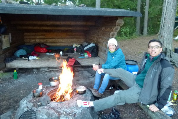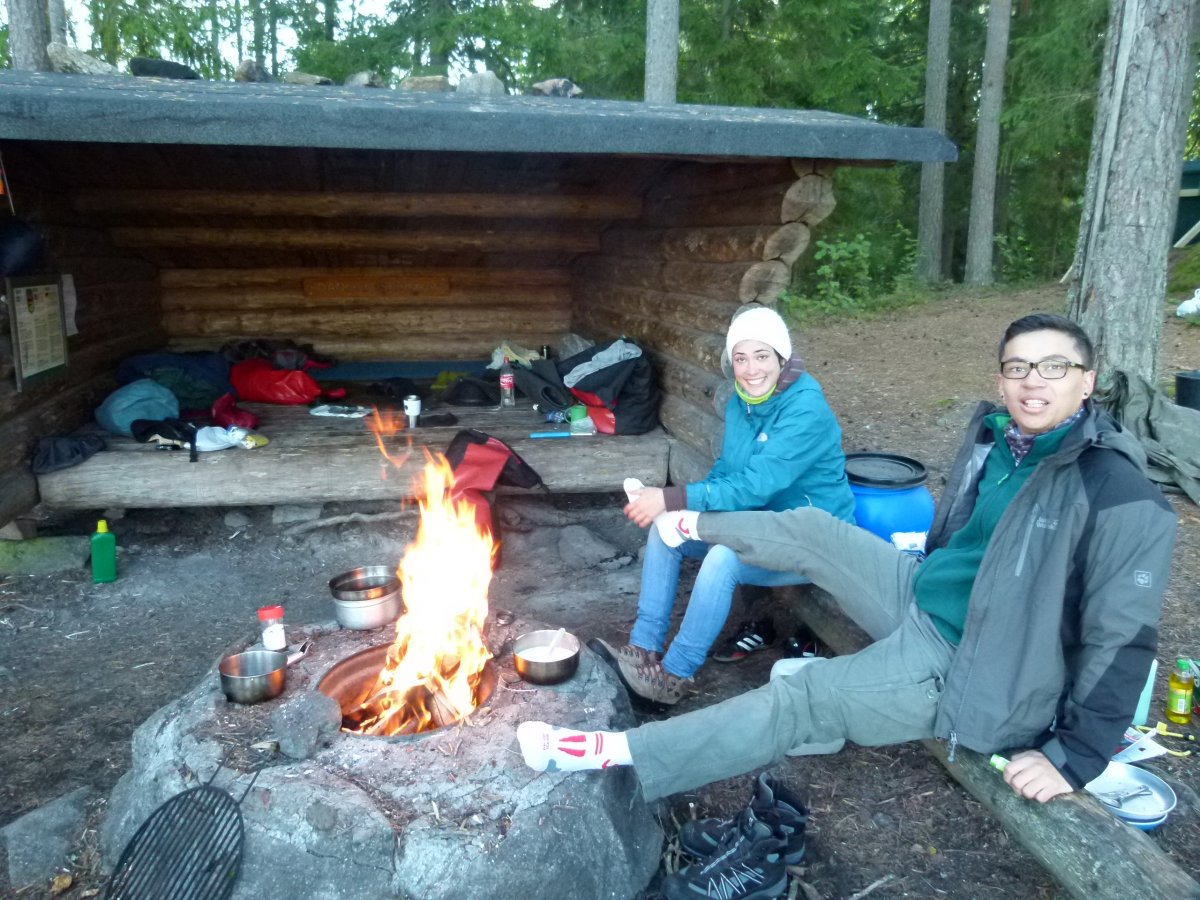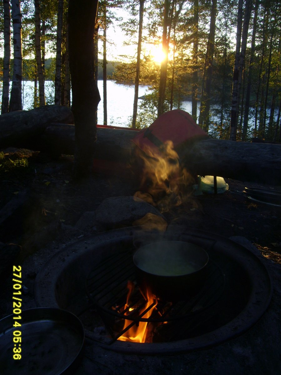 Nach anfänglichen Problemen mit unserer Paddelkoordination und hohem Wellengang, peilten wir ein nicht so weit gelegenes DANO (Nr.18) an. Nach dem ersten erfrischenden Badegang im Foxen ging es ans Essen machen, wobei wir erstmal unsere Schwierigkeiten mit dem Lagerfeuer und nassem Holz hatten. Dank der Mithilfe des beiliegenden Spiritus gelang uns doch ein beachtliches Feuer auf dem wir eine doppelte Menge unserer heiß ersehnten Terence-Hill-Pfanne (aus dem hilfreichen Outdoor-Kochbuch) zubereiten konnten, denn zwischenzeitlich gesellten sich zwei äußerst nette Mitkanuten zu uns. So konnten wir bei einem Becher Rotwein den Abend gemeinsam ausklingen lassen.