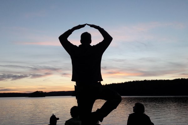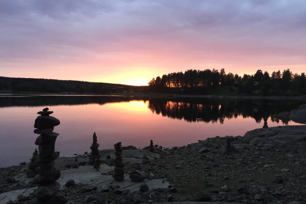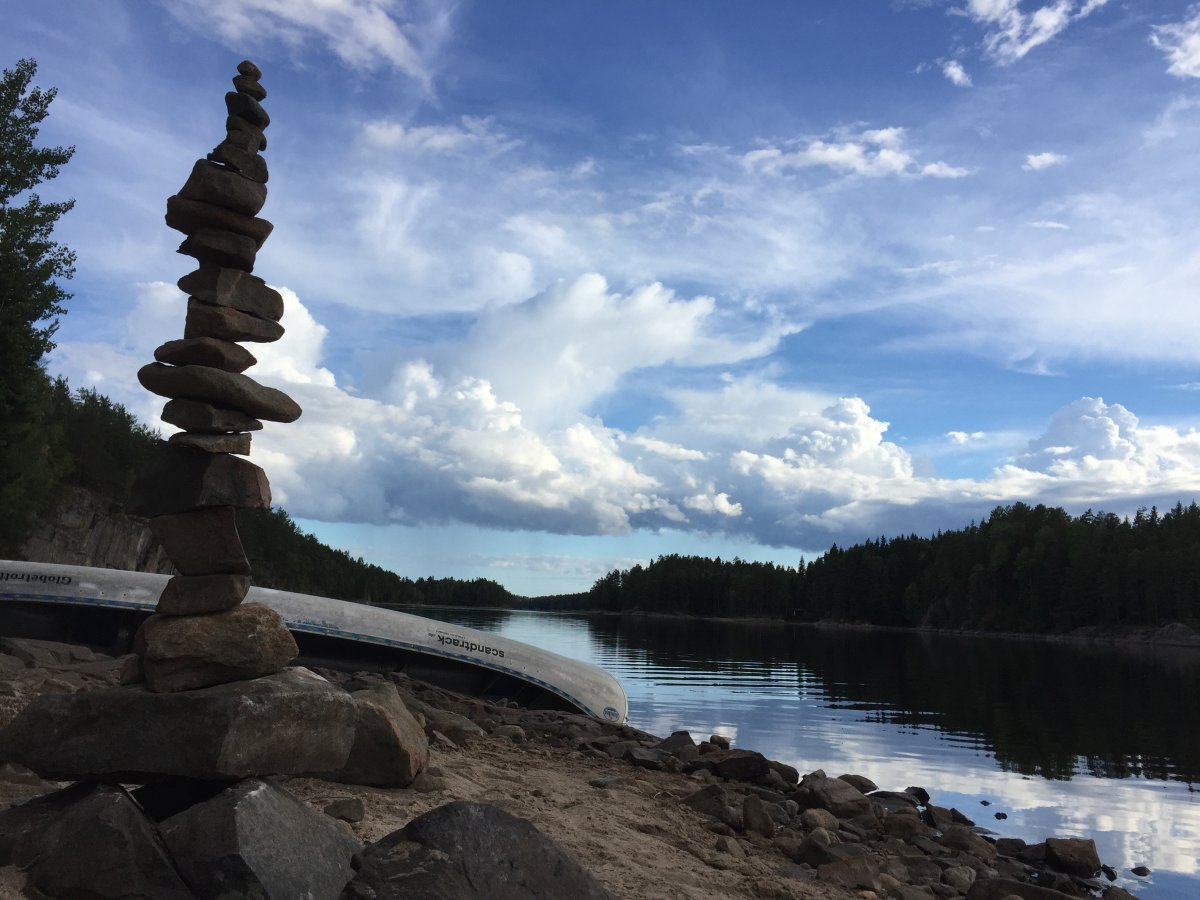 Nach einem Spaziergang um die Insel, dann gab es zum Abendessen die Terence-Hill-Pfanne mit frischem Brot aus Töcksfors. Anschließend bauten wir alle ein Steinmännchen in der West-Bucht und das Segel wurde mit Segelbaum und der Möglichkeit es einzuholen verbessert. Wir schauten uns gemeinsam den Sonnenuntergang an und machten kitschige Photos. Als es dunkel wurde, gab es noch die zwei Barsche aus der Pfanne und etwas später Milchreis mit lustigen Wander- und Militärgeschichten.