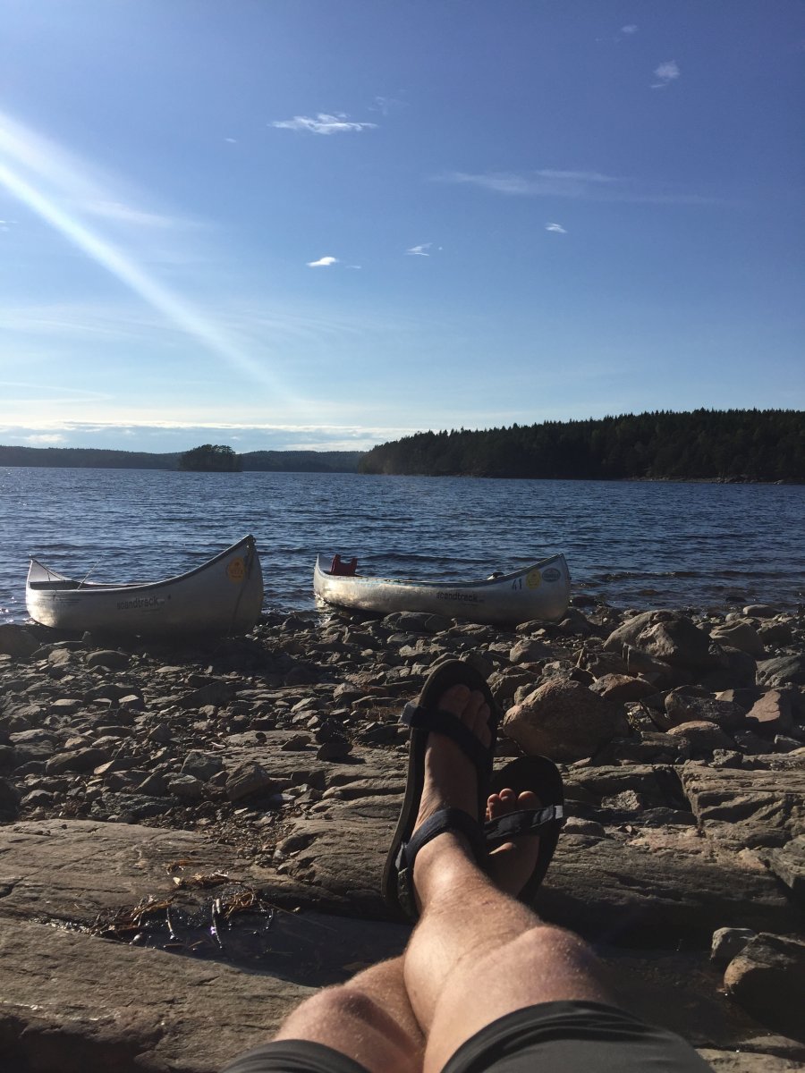 Wir paddelten/segelten bis zum Campingplatz 22. Auf der „Ameiseninsel“ angekommen, schlugen wir das Lager auf. Es wurde eine Hängematte nahe der Feuerstelle aufgehängt. Ein Teil der Gruppe paddelte nach Töcksfors zum Einkaufen. Der Rest machte Holz und vertrieb sich die Zeit mit Spielen und Lesen bis zur Rückkehr der Einkäufer.
