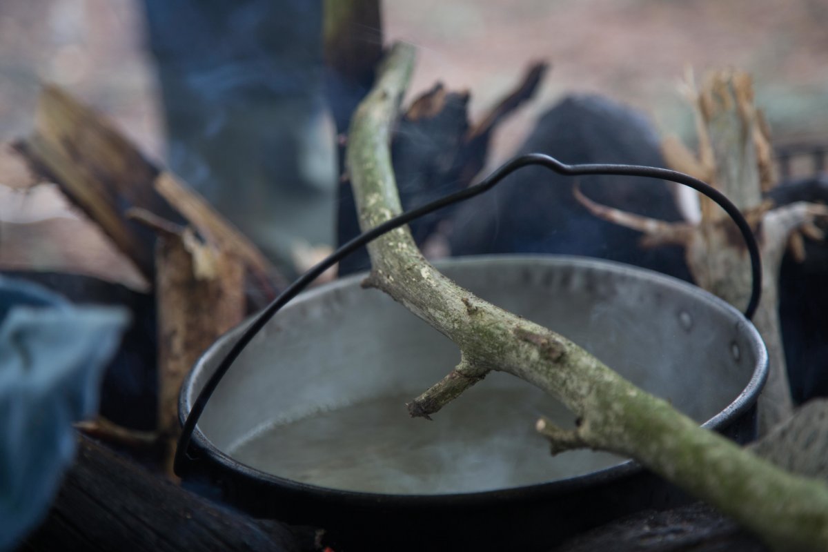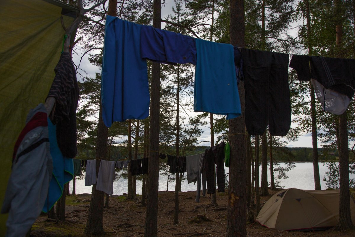 Wir machten Feuer und katalogisierten die Essensvorräte. Weitere Tarps wurden zwischen den Bäumen und mit aufgestellten Ästen befestigt und in jedem Moment ohne Regen trockneten wir die nassen Sachen auf Leinen und am Feuer. Ein insgesamt ruhiger Tag wurde dann mit Bratkartoffeln und Speck, Hörbuch, viel Schlafen und Ruhen und später Milchreis und Kakao beschlossen. Da der Wetterdienst für den nächsten Tag Regen vorhersagte, stimmten wir in der Gruppe dafür, noch einen Tag länger an diesem schönen Platz zu bleiben – natürlich nur für den Fall, dass keine andere Gruppe ihn in Anspruch nehmen wollte.