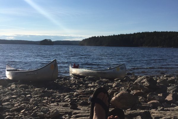 Wir landeten an Hütte 11 an und dort trafen wir auf die Chaotentruppe vom ersten Tag, mit denen wir beinahe unser Gepäck verwechselt hätten. Sie waren noch nicht aufgebrochen, würden uns aber den Platz überlassen. Wir luden die Kanus aus und spannten zwei Tarps gegen den starken Wind von Süden. Nachdem die andere Gruppe weg war – wir hatten noch Knoblauch gegen Zwiebeln getauscht – bauten wir auf und gingen schwimmen.