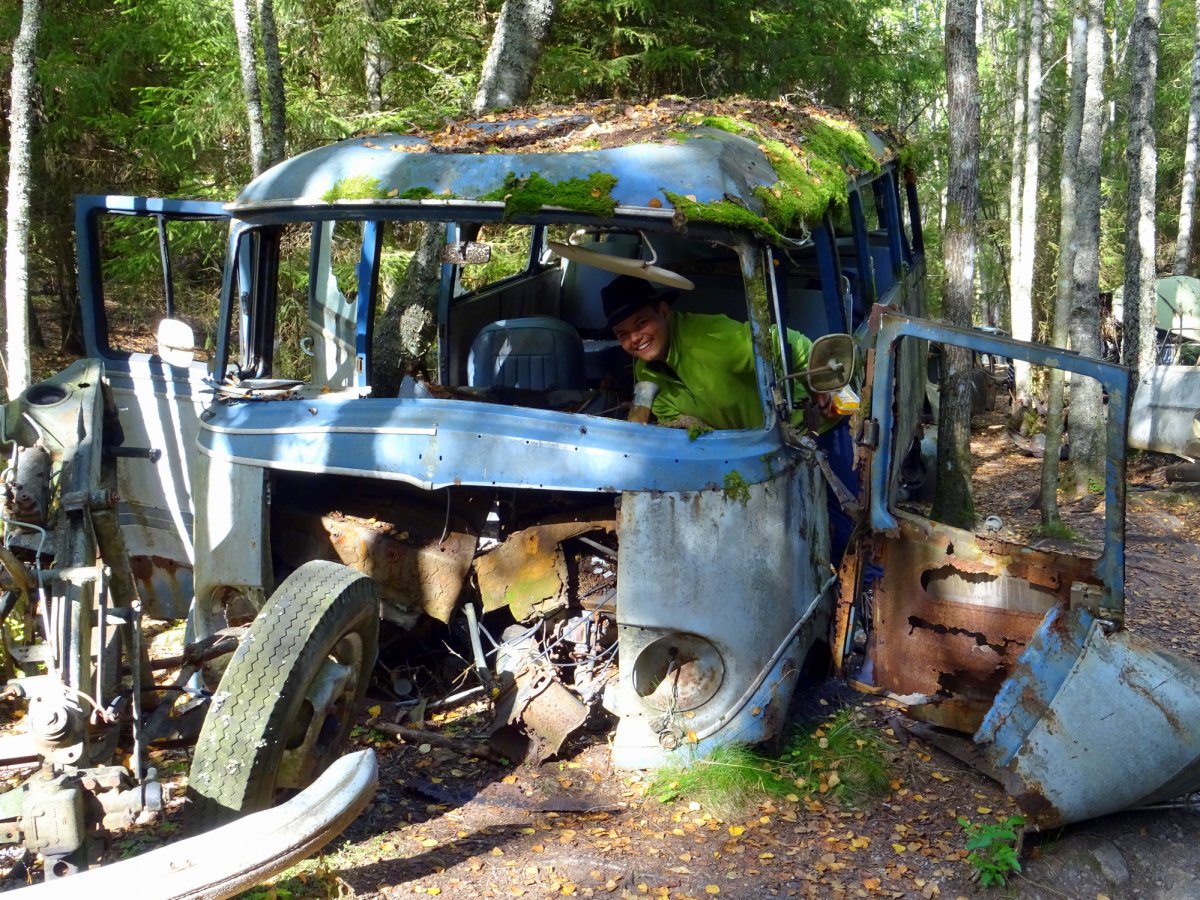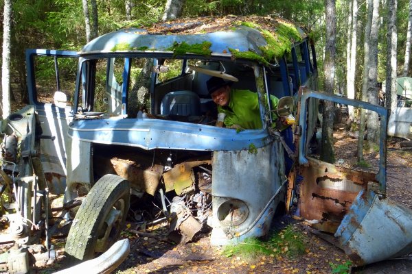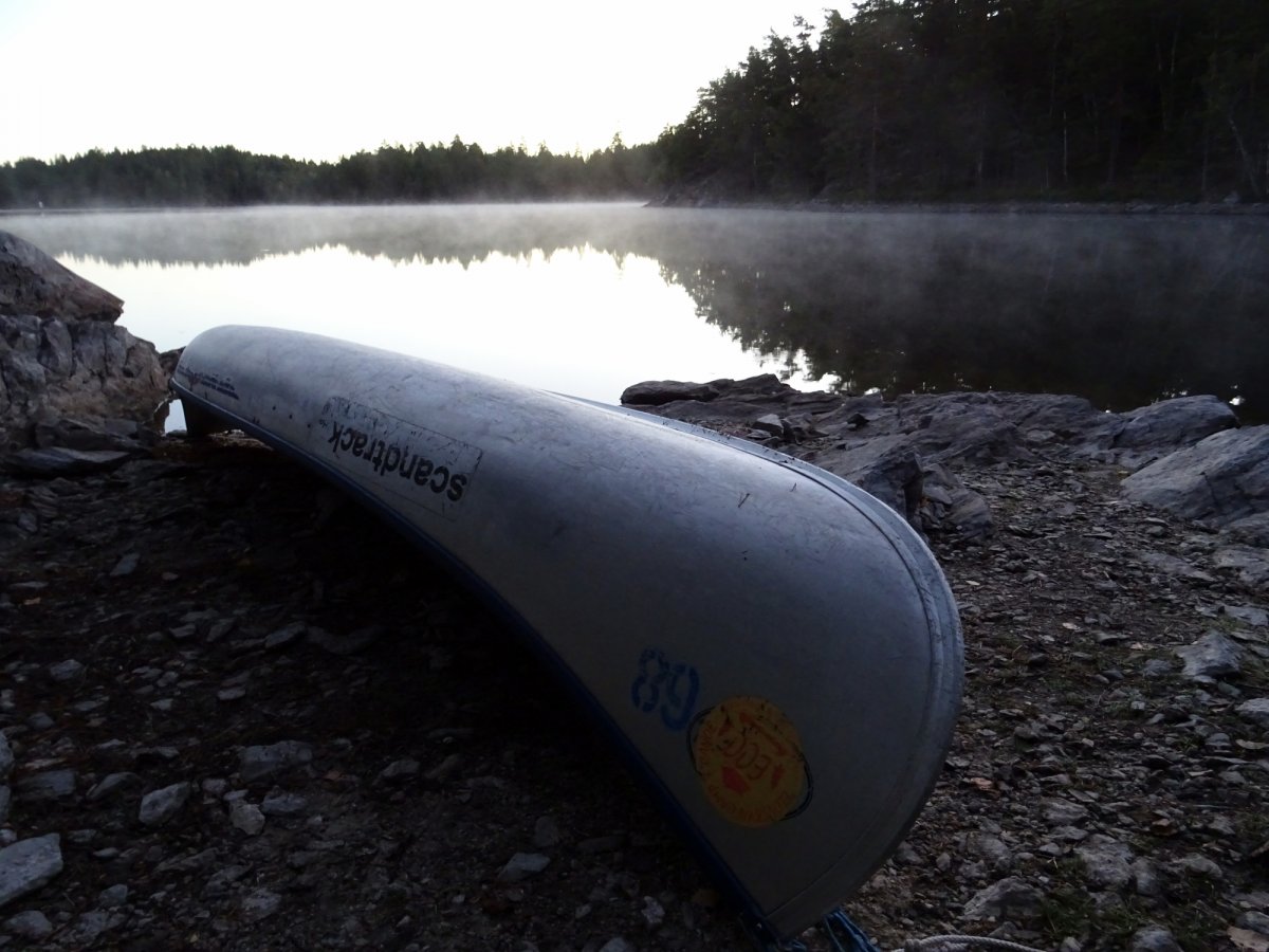 Der neue Tag begann mit einem atemberaubenden Sonnenaufgang samt mystischen Nebelschwaden auf dem Wasser. Motiviert starten wir nach dem Lagerabbau Richtung Foxen und passieren enge sowie reizvolle Insel-Durchfahrten. Dann, plötzlich, lag er vor uns in seiner ganzen breite – der Foxen. Da er wesentlich größere Ausdehnungen zwischen seinen Ost-West-Ufern aufweist als der Stora Le, hat der Foxen eine vollkommen andere landschaftliche Wirkung. Auf unserem Weg entlang des Ostufers Richtung DANO 18 kamen wir uns in unserer kleinen Nussschale deshalb wesentlich unbedeutender vor als noch vor wenigen Stunden im Stora Le. Wieder erreichten wir gegen Mittag unser Tagesziel nach ca. 9 km und mussten das DANO am Festland erst einmal suchen. Versteckt in einer kleinen Bucht neben einem augenscheinlichen Privathaus samt Anlegestelle, fanden wir es dann doch und zogen unser Boot den Sandstrand hinauf um den Lageraufbau zu starten. Die günstige Lage nutzten wir aus und machten uns auf den Weg nach Bastnäs einem Ort mit Autofriedhof in 2,5 km Entfernung. Meine abenteuerlustige Begleiterin entdeckte einen Forstweg der nach ca. 800 m die Hauptstraße erreicht, welche dann direkt zu unserem Ziel führte. Die Sonne lachte, währenddessen wir den pilz- sowie moosreichen Forst durchstreiften, sodass uns am Autofriedhof angekommen, eine gänzlich unpassende Stimmung von Sommernachmittag entgegenstrahlte. Trotz der Warnungen der Hinweisschilder am zentralen Haupthaus des Friedhofes („…es hört dich niemand schreien…“ usw.) untersuchten wir das Gelände und bestaunten die hunderten Autos welche im Wald verrotten und von der Natur langsam verschluckt werden. Durch das schöne Wetter wurde uns aber gleichsam bewusst welch große Umweltsünde dieser Ort eigentlich darstellt. Der Duft von Altöl ließ erahnen, dass der gesamte Boden des Geländes bereits verseucht ist. Nachdenklich machten wir uns auf den Rückweg entlang der Hauptstraße und genossen die ansonsten intakte Natur um uns herum. Am DANO wieder angekommen ging es an die Feuerholzgewinnung. Hierzu zerlegten wir einen ordentlichen Birkenstamm welcher jedoch noch sehr frisch und feucht war. Leider bestätigten sich unsere Befürchtungen und die Brennbarkeit war enttäuschend, sodass wir Nudeln mit unseren Spiritusbrenner kochten um satt zu werden. Das DANO war durch seine Waldlage vollkommen anderer Art. Es wies eine große Rasenfläche auf, welche von niedrigen Hecken umringt war. Gleichzeitig hatte die Toilette ein Spitzdach und war so fest verrammelt, dass sie leider für uns nicht nutzbar war. Zudem herrschte hier ein ausgesprochen großes Insektengewimmel. In Summe war DANO 18 das schlechteste von uns besuchte DANO auf unserer Tour, sodass wir dazu neigen zu raten von dem Besuch dieser Lagerstätte Abstand zu nehmen. Aufgrund der Insekten und der düsteren Lage des DANOS verkrochen wir uns früh in unsere Kojen um am nächsten Morgen ebenso früh zu starten.