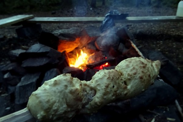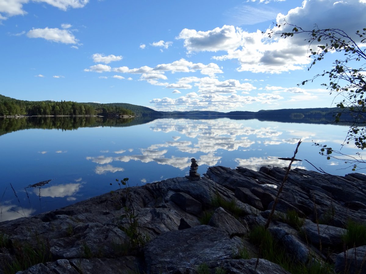 Der neue Tag begann für uns mit einem spektakulären Sonnenaufgang um 6:00 Uhr morgens bei dem der Frühnebel magisch über dem Wasser schwebte und mit der spiegelglatten Seeoberfläche für ein mystisches Gesamtbild sorgte. Wenig später stärkten wir uns an einem guten Frühstück mit Eiweißbrot, Milchpulver sowie Müsli und beluden unser Boot schon recht routiniert für die zweite Etappe. Diese sollte recht kurz ausfallen da unser nächstes Ziel die Insel Trollön sein sollte. Trollön, mit seinen zwei DANOs, war lediglich 4 km entfernt und wird von der Ländergrenze Norwegen-Schweden geteilt, was einer der Gründe war, weshalb wir dieses kleine Eiland ansteuerten. Wir fuhren bei gutem Wetter und Sonnenschein gemächlich unserem Ziel entgegen und landeten auf norwegischer Seite am offiziellen Rastplatz kurz vor Mittag. Zu unserer Überraschung war der Rastplatz neben obligatorischem Feuerplatz, Schutzhütte und Trockenklo mit zahlreichen Mülltonnen ausgestattet deren Wert wir erst im späteren Verlauf unserer Reise zu schätzen lernen sollten. Wie fast überall an den offiziellen Rastplätzen, war die Suche nach einem geeigneten Plätzchen für unser Zelt mühselig, wenn man keine unbequemen Wurzeln unter sich dulden wollte, am Ende jedoch von Erfolg gekrönt. Kurzum entfachten wir unter Mühen mit dem am Lagerplatz vorhandenen jedoch leider nassen Holz ein Feuer und kochten uns Bratkartoffeln. Nach diesem Mittagssnack wollten wir die Insel erkunden und einen der kartographierten Grenzsteine aufsuchen. Nach einer illustren Inseltour über Stock und Stein erreichten wir diesen auf einem höher gelegenen Plateau mit Seerundblick und schossen das obligatorische Touri-Foto mit besagter Ländergrenze. Am frühen Abend entfachten wir am Lagerplatz erneut ein Feuerchen und kochten uns heißes Wasser. Ja heißes Wasser – man braucht es eigentlich ständig und für alles Mögliche, ob Aufwasch, Tee oder heiße Dusche. Die moralische und hygienische Wirkung einer heißen Dusche ist ebenso wenig zu unterschätzen wie die Zeit, die es dauert, eiskaltes Seewasser auf Kochtemperatur zu bringen. Auf jeden Fall ist für uns eine „Pocket-Shower“ ein „Must-Have“ für eine Outdoor-Kanu-Tour und dieser handlicher Duschsack, gefüllt mit warmen Wasser vom Feuer, wurde unverzichtbar um Laufe unseres kleinen Abenteuers. Wir trieben es sogar soweit, dass für uns eine der Grundbedingungen für einen guten Lagerplatz, das Vorhandensein eines Baumes mit einem Ast auf der idealen Höhe zum Aufhängen des Duschsackes wurde. Den Abend ließen wir mit Tee sowie mit Stockbrot (zum ersten und letzten Mal, da für uns das Aufwand-Nutzen-Verhältnis nicht optimal) ausklingen.