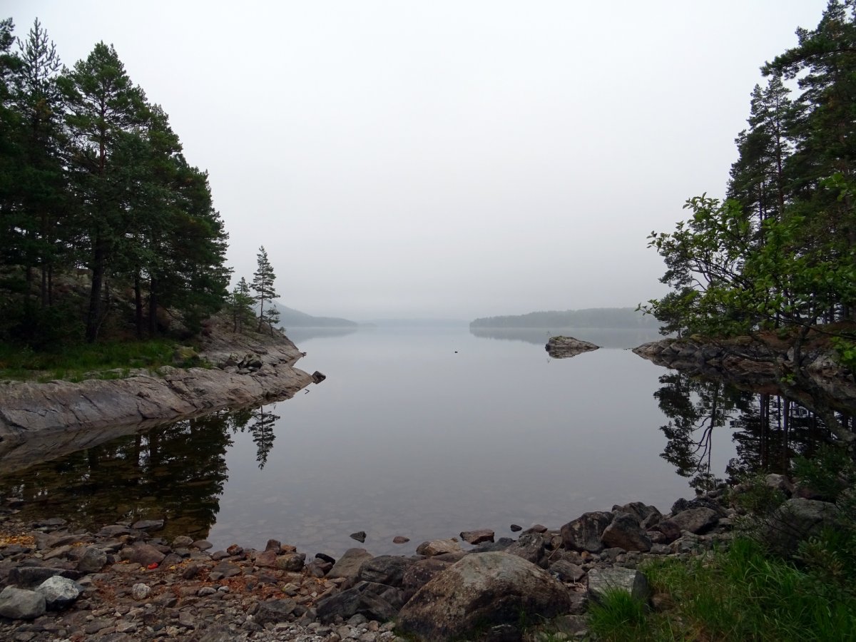 Heute sollte kein Lagerabbau am frühen Morgen erfolgen, da wir beschlossen einen Ausflug ins nahe gelegene Nössemark vorzunehmen. Dieses kleine romantische Städtchen lag in etwa 6 km entfernt und sollte sogar mit einem Landhandel aufwarten. Der Morgen war grau und Nebelverhangen, jedoch auch absolut Windstill. Der Anblick des Stora Le im Nebel mit absolut glattem Wasser lässt sich nur als magisch bezeichnen und beflügelte die Fantasie hin in eine Sagenwelt aus Trollen und Gnomen. Mit Minimalladung und einem etwas mulmigen Gefühl lassen wir unser Zelt auf der Insel zurück und stechen in See. Schon von weitem hört man das gleichmäßige Tuckern der Fähre welche kurz vor der Bucht von Nössemark über den See pendelt. Unsere Sorgen über durch die Fähre verursachten Wellen erwiesen sich als unbegründet und so konnten wir ungehindert unserer Wege ziehen. Die Bucht erstreckt sich weit, aber früh zeichneten sich der kleine Kirchturm und das Hafengelände am Horizont ab. Am Hafen angekommen schoben wir unser Boot aufs trockene und schauten uns unsicher um ob wir auch wirklich im öffentlichen Hafenbereich gelandet waren. Ein blaues, rundes Schild mit gelbem Anker, kündet jedoch davon, sodass wir uns kurz am Ufer auf einer Parkbank nieder- und die ersten Eindrücke des Ortes auf uns wirken ließen. Direkt am Hafen schließt sich ein zu dieser Jahreszeit recht leerer Campingplatz an. Rundherum sind die typischen, bunten schwedischen Häuser aufgestellt. Ein ebenso farbenfrohes Haus an der beschaulichen Hauptstraße mit einem entsprechend großem Werbeschild entpuppte sich als der in unserer Karte eingezeichnete Landhandel. Wir beschlossen diesen kleinen Laden schon wegen der Besichtigung des Angebotes einen Besuch abzustatten. Beim Betreten des kleinen Geschäftes, grüßten wir die schwedische Verkäuferin in unserem besten schwedisch und wünschten einen guten Morgen. Anschließend bummelten wir durch die Auslagen und stellten fest, dass wir Alufolie, grünen Jasmin Tee und Body-Lotion spontan benötigten. Nach unserem Einkauf genossen wir noch etwas die Örtlichkeit und machten uns mit unserem guten Kanadier Nr. 68 auf den Rückweg. Erschöpft kamen wir nach immerhin 12 km paddeln wieder auf „unserer“ Insel an und sahen beglückt, dass unsere Ausrüstung samt Zelt dort standen wo wir sie zurückgelassen hatten. Den Abend ließen wir entspannt mit einem extrem leckeren Jägerbraten ausklingen und genießen dabei die untergehende Sonne.