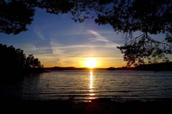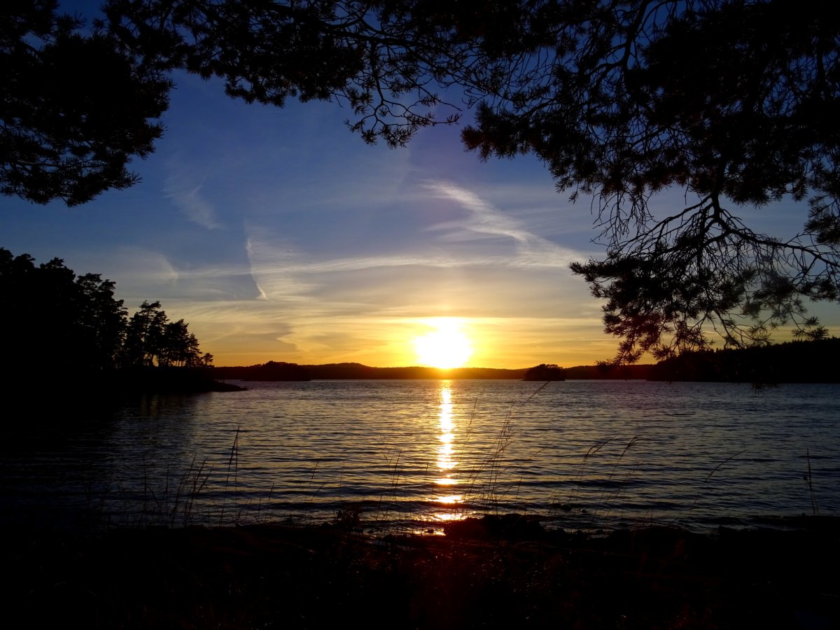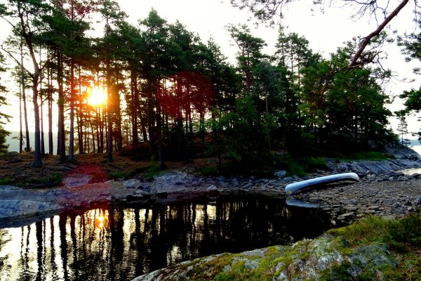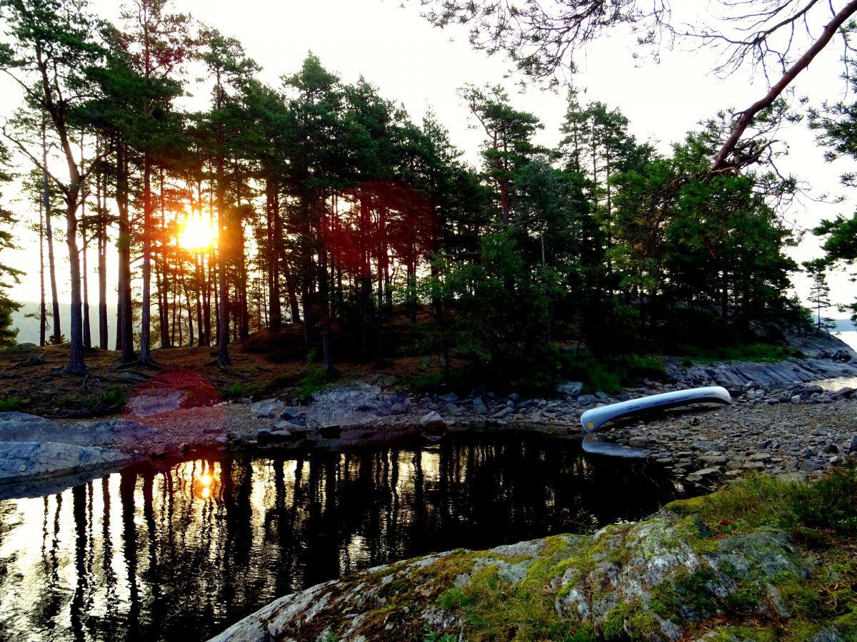 Die Nacht brachte kurzzeitigen Regen über unser Zelt, sodass wir aus einem feuchten Zelt am Morgen klettern mussten. Der Himmel war grau verhangen und der Wind Pfiff kräftig aus Süden. Da wir es auf unserer Tour nicht eilig hatten, beschlossen wir auf Trollön eine weitere Nacht zu verbringen und so unserem Zelt die Möglichkeit zu geben in Ruhe abzutrocknen. Jeder der es schon einmal auf einem Camping-Ausflug erlebt hat weiß – ein nasses Zelt einzupacken macht spätestens beim Wiederaufbau keinen Spaß. So bezogen wir nach dem Frühstück die windgeschützte Hütte des DANOs und beobachteten das Treiben der Natur und Menschen um uns herum. Besonders erwähnenswert sind hierbei die herumtollenden Eichhörnchen und Spatzen welche für viele amüsante Momente sorgten. Zusätzlich konnten wir auf unserem Beobachtungsposten das von Scantrack neu angebotene Hausboot verbeischippern sehen, welches für uns einen recht absonderlichen Anblick darstellte [Es geht eben nichts über einen ordentlichen Kanadier ;-)]. Der Tag flog dahin und wir machten einen kleinen Entdeckungsexkurs über den schwedischen Inselteil von Trollön. Hierbei stießen wir, zu unserer Freude, auf einen Weg Richtung Norwegen, sodass wir bei dem Kanupärchen von gestern kurz für einen Small-Talk vorbeischauten. Mithilfe des entdeckten Pfades war uns möglich unseren Müll bei den Mülltonnen auf norwegischer Seite zu entsorgen, was nach über einer Woche tatsächlich sehr gelegen kam. Der Tag verging im Flug und die Sonne kämpfte sich am Nachmittag ihren Weg durch die Wolken. Am späten Nachmittag konnten wir drei verirrten Paddlern, welche zu Fuß die Insel erkundeten, den Weg zum nächsten DANO auf norwegischer Seite weißen wo das Kanupärchen bereist abgerückt war. Am Abend erlebten wir den schönsten und farbenreichsten Sonnenuntergang unserer Reise welcher von uns gebührend bewundert wurde.