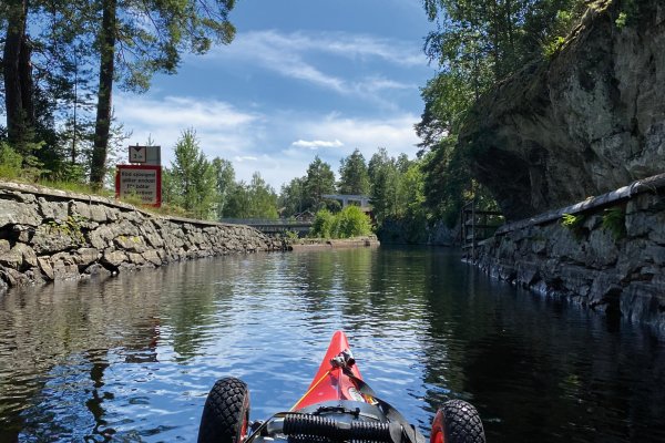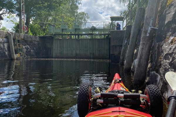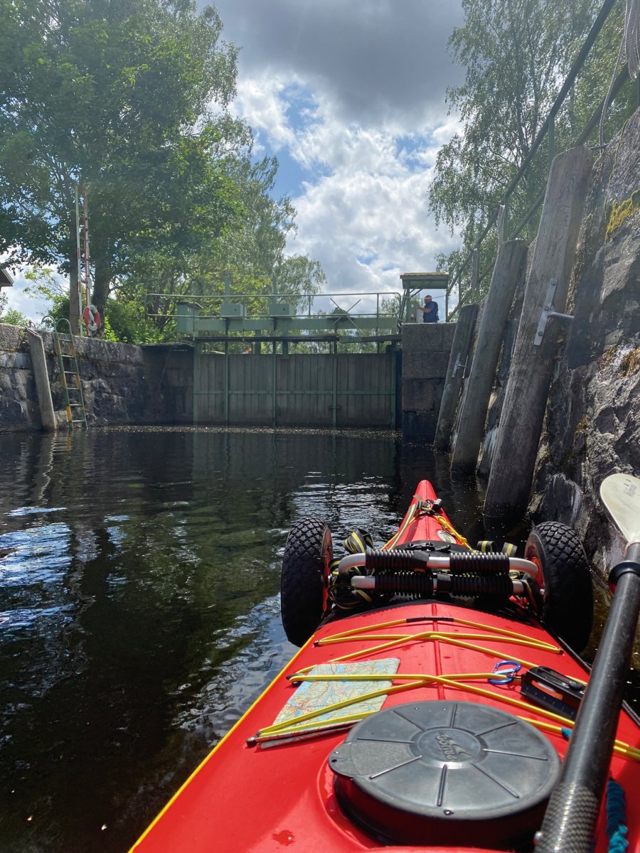 Nachdem ich mich von den Beiden verabschiedet habe ging es bei strahlendem Sonnenschein los über den Foxen See Richtung Lennartsfors. Da das Hauptlager von Scandtrack kurz davor lag, wollte ich es mir einmal anschauen, doch merkte schnell das die Jungs und Mädels allerhand zu tun haben wenn kein Anreisetag der Busse ist. So wollte ich sie nicht weiter Stören und habe mich schnell wieder ins Kajak gesetzt und bin durch die Schleuse gefahren.