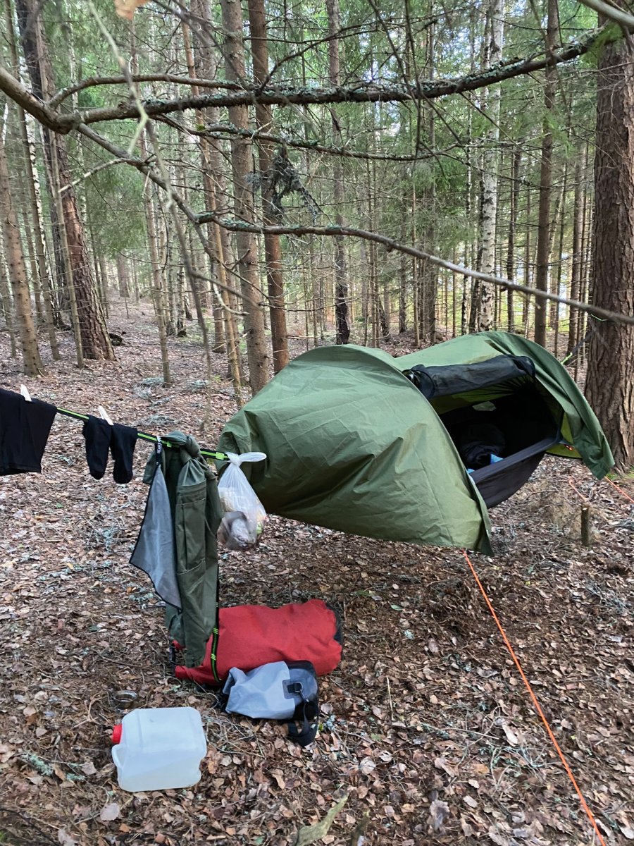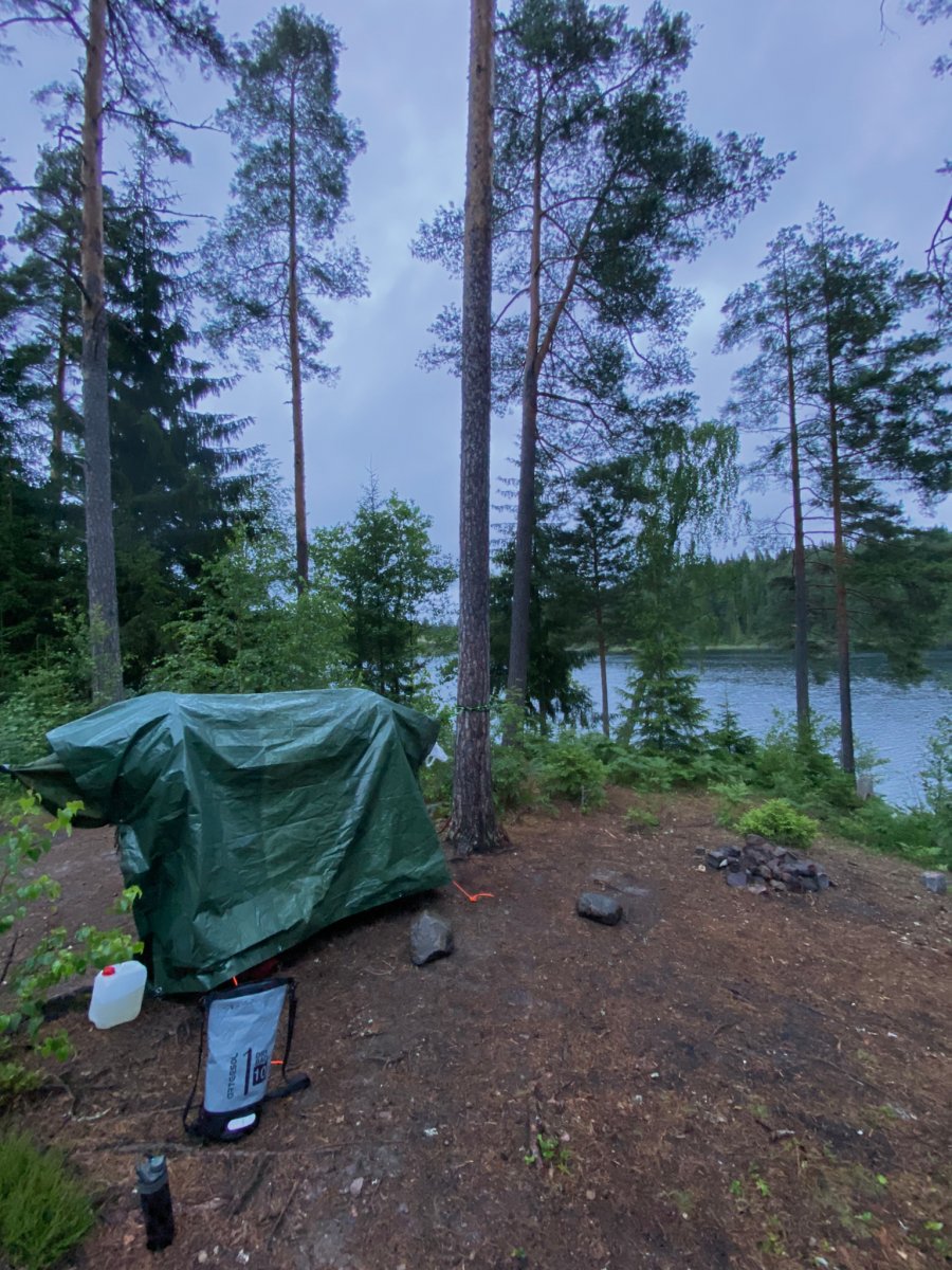Um drei Uhr Morgens wurde ich davon aus dem Schlaf gerissen, dass meine Hängematte wild umhergewirbelt wird. Wie ich später bemerkt hatte, hat sich der Wetterbericht von Regen auf Sturm gewandelt. Ich hatte am Abend bzgl. dem Regen extra nochmal nachgeschaut. Blöd gelaufen. Um meine Wäsche trocken zu halten habe ich mir ein großes Segel gebaut was mich nun umher schleuderte. Schnell abgemacht und schon lag ich wieder in der immer noch gut schaukelnden Hängematte. Den Tag über habe ich fast ausschließlich mit lesen verbracht. Noch so ein Tag an dem ich nichts machen konnte, verdammt! Leider kam die Warnung von Scandtrack per SMS erst am Abend bei mir an, als der Wind bereits deutlich nachgelassen hatte. Meine Hängematte habe ich dann etwas weiter in einen Wald reingehängt und dort auch den restlichen Abend verbracht. So viel am Stück gelesen habe ich in meinem ganzen Leben noch nie! Gott sei dank habe ich mir zwei Bücher mitgenommen, das Erste war bereits nach dem verregneten Tag 6 durchgelesen.