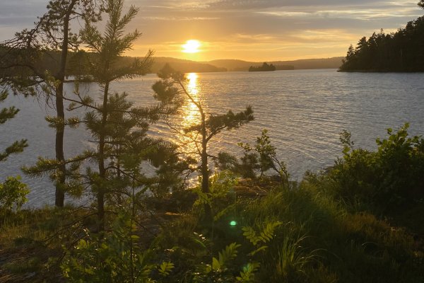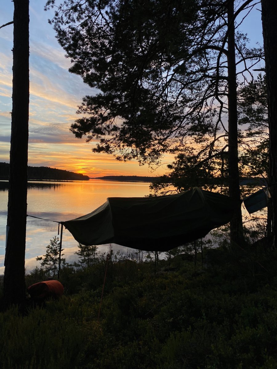 Am Horizont konnte ich ein Kajak mit zwei Paddelschlägen entdecken und dachte mir noch das es ja ganz nett wäre noch jemanden auf der Insel zu haben. Leider lag ich falsch und um so näher es kam desto lauter wurden die Kleinkinderschreie. Ich wollte einen ruigen und entspannten Abend haben ohne viele Menschen, am besten gar keine. Ich hatte mich dann dazu entschieden noch weiter zu fahren, um kurze Zeit später einen anderen Ort zu finden. Doch mich packte der Ehrgeiz, so bin ich um 22 Uhr ganze 7 km und zwei Stunden später an der Schleuse von Haverud angekommen (20km insgesamt). Belohnt durch einen Bildschönen Sonnenuntergang konnte ich die Schleuse betrachten und mich dann in die Hängematte legen.
