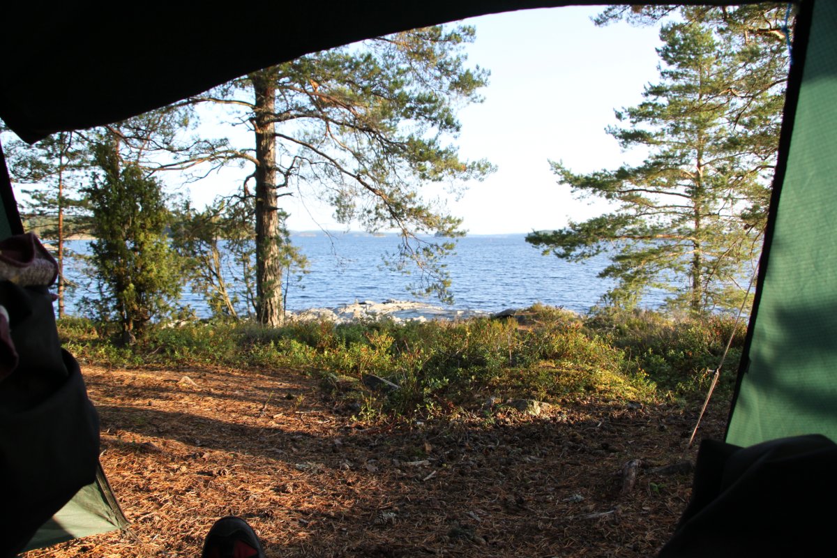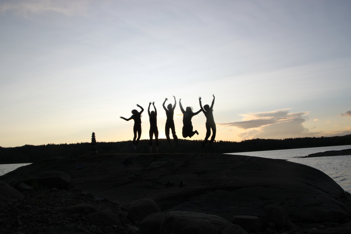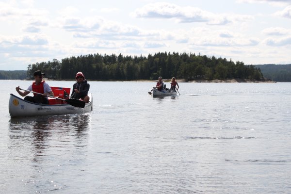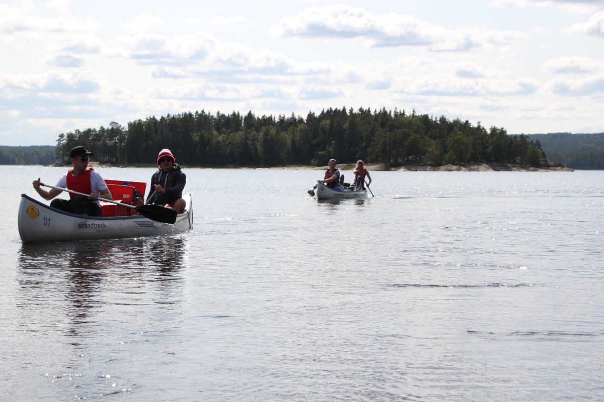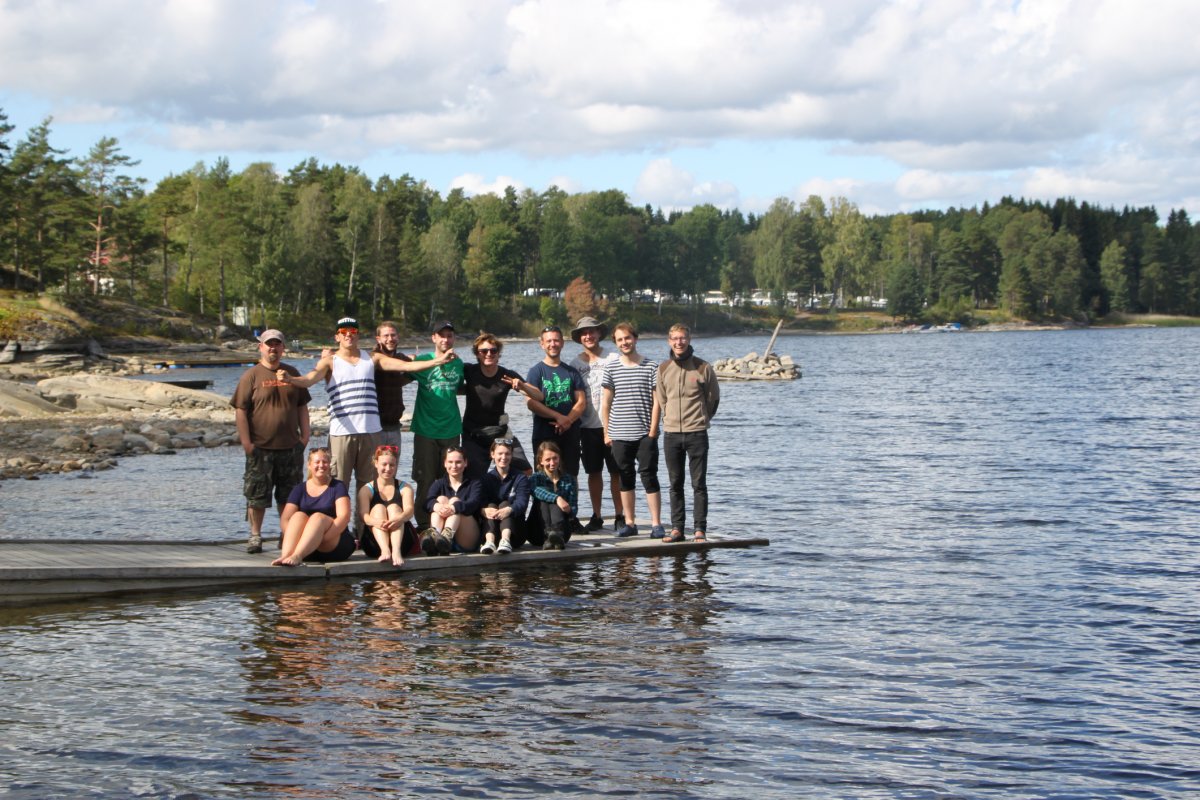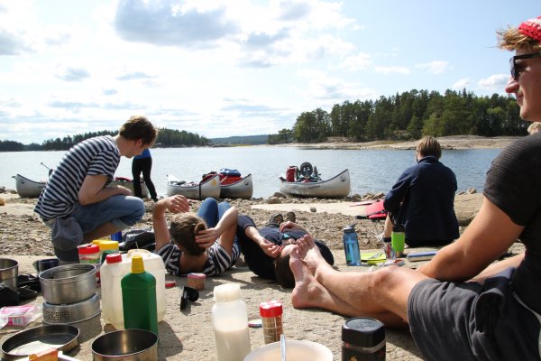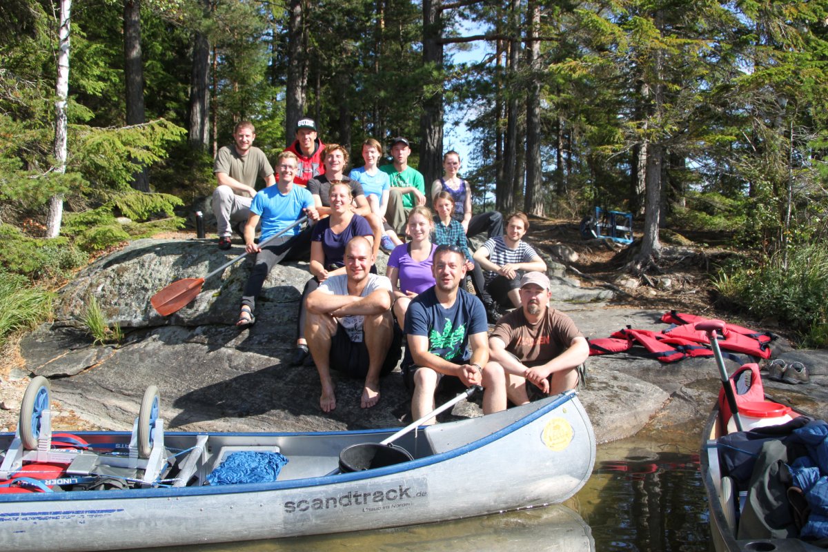 An unserem letzten echten Kanutag wollte das schwedische Wetter wohl noch einmal beweisen, dass es um Längen besser ist als sein Ruf und so wurden wir also mit strahlendem Sonnenschein geweckt. Neben dem üblichen Zusammenpacken nutzten wir außerdem noch die Gelegenheit und machten mit freundlicher Mithilfe unserer Inselmitbewohner noch schnell einige Gruppenbilder.