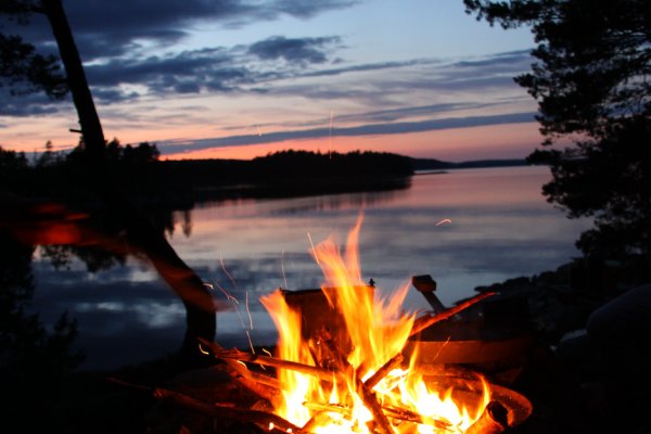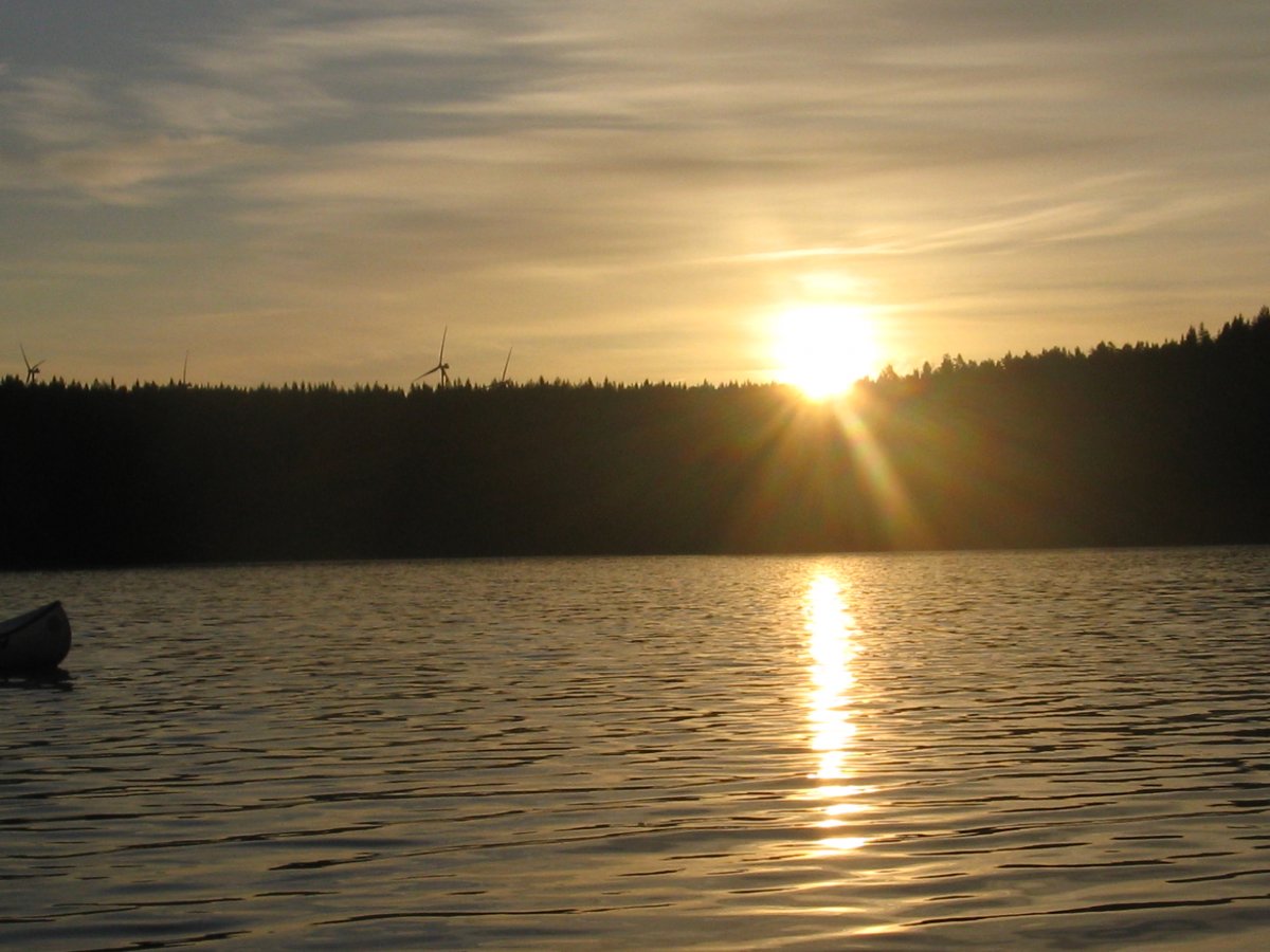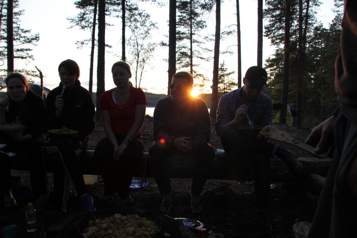 Die Vorräte wurden gesichtet und insbesondere die Menge an Eiweißbrot für befriedigend groß eingeschätzt. Nach der ersten Mahlzeit (Nudeln mit Tomatensoße) wurde sich weiter kennengelernt und Erwartungen ausgetauscht (Vorwiegend zwischen „Eigentlich gar keine“ und „Morgens in den Sonnenuntergang paddeln“). Wir genossen den Sonnenuntergang am gemeinsamen Lagerfeuer bis es irgendwann in die Zelte ging.
