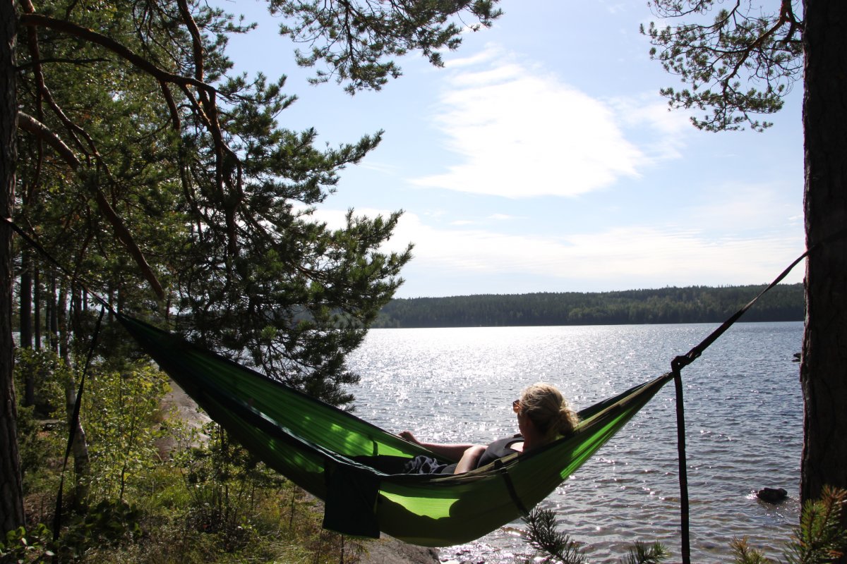 Die andere Hälfte verbrachte die Zeit im Lager mit Baden, den Ausblick aus der mitgebrachten Hängematte genießen und Abendessen (Linseneintopf) vorbereiten. Außerdem lernten wir unsere neuen Nachbarn kennen, die uns freundlicherweise eine funktionstüchtigere Säge liehen und uns nebenbei noch ein bisschen was über Pilze erzählten. Abends konnten wir einen wahnsinnig schönen Sonnenuntergang bewundern und jede Menge Fotos auf einem Stein am/im Wasser machen.