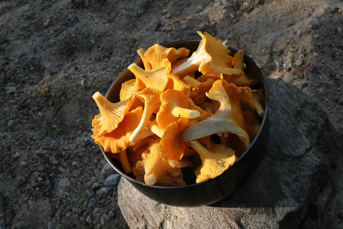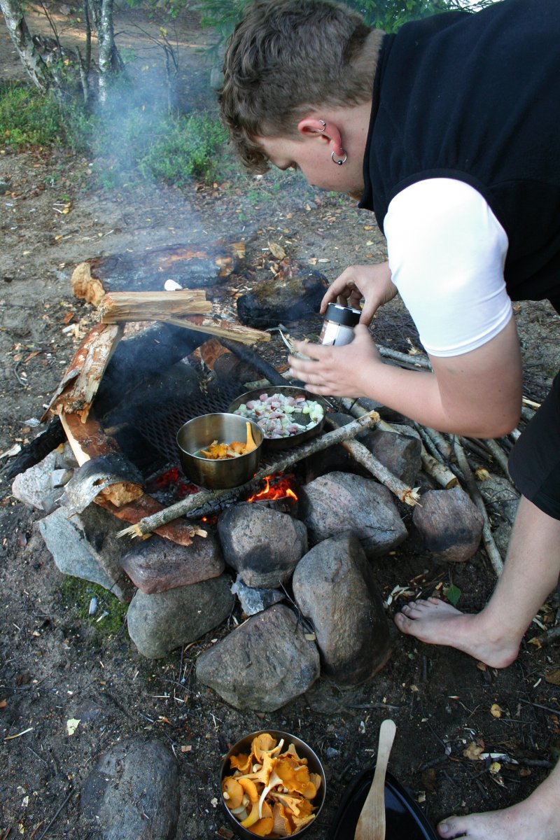 Wir haben in den 2 Wochen nie auf einem offiziellen Zeltplatz übernachtet sondern fanden immer wunderschöne Plätze zum Übernachten: einen kleinen Strandabschnitt mit höher gelegenem Zeltplatz, eine einsame Bucht, das Steilufer an einem Zeltplatz wo ein Kettensägenkünstler aus den Stümpfen von Bäumen Wichtel und Meerfrauen gesägt hat die einfach so in der Landschaft stehen etc. Meist wurden diese Plätze noch interessanter durch das vorhandene Nahrungsangebot: Beeren en masse, Pfifferlinge, Maronen, Steinpilze, Fische…. Kleiner Tipp für die doch ziemlich sauren Preiselbeeren: über Nacht leicht einzuckern, morgens Brot mit Öl in der Pfanne knusprig rösten, dann die gezuckerten Beeren dazu und aus der Pfanne als leckeres Frühstück löffeln. Generell war die Verpflegung prima, wir hatten von zuhause noch Rum, Kakao, Knoblauch und Sprühsahne mitgenommen und konnten uns deswegen Luxus leisten wie heißen Lumumba am Lagerfeuer, Pfifferlingspfanne mit Speck, Beerenkompott mit Sahne oder Steinpilze-Eintopf mit Knoblauch……Lecker!