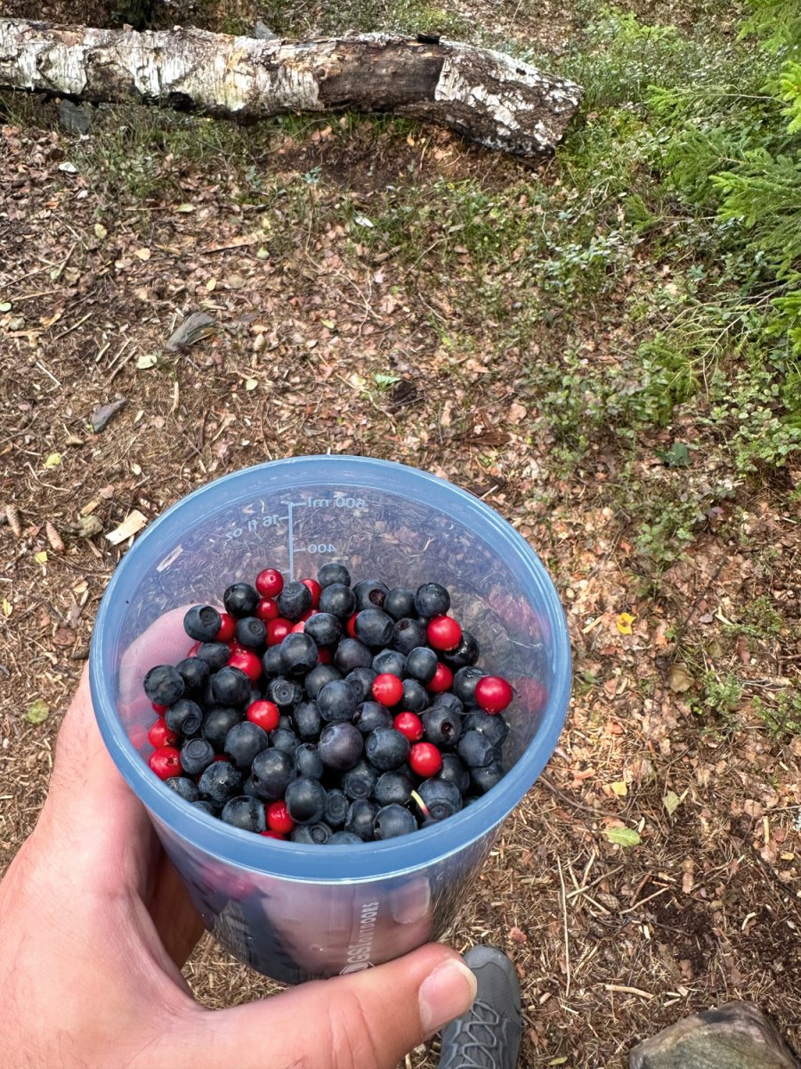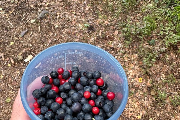 Anstatt uns über das schlechte Wetter zu ärgern, beschlossen wir, das Beste daraus zu machen. Wir zogen unsere Regenjacken an und machten uns auf, die Umgebung zu erkunden. Die Landschaft war auch im Regen beeindruckend – der Wald war still und geheimnisvoll, die Blätter glänzten vom Wasser, und die Luft war frisch und sauber. Auf unseren Streifzügen durch den Wald entdeckten wir bald große Büsche mit reifen Preiselbeeren und Heidelbeeren. Die roten und blauen Beeren leuchteten inmitten des Grüns, und so beschlossen wir, die Zeit sinnvoll zu nutzen und ein paar dieser Waldschätze zu pflücken.