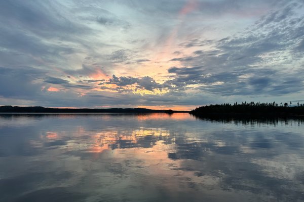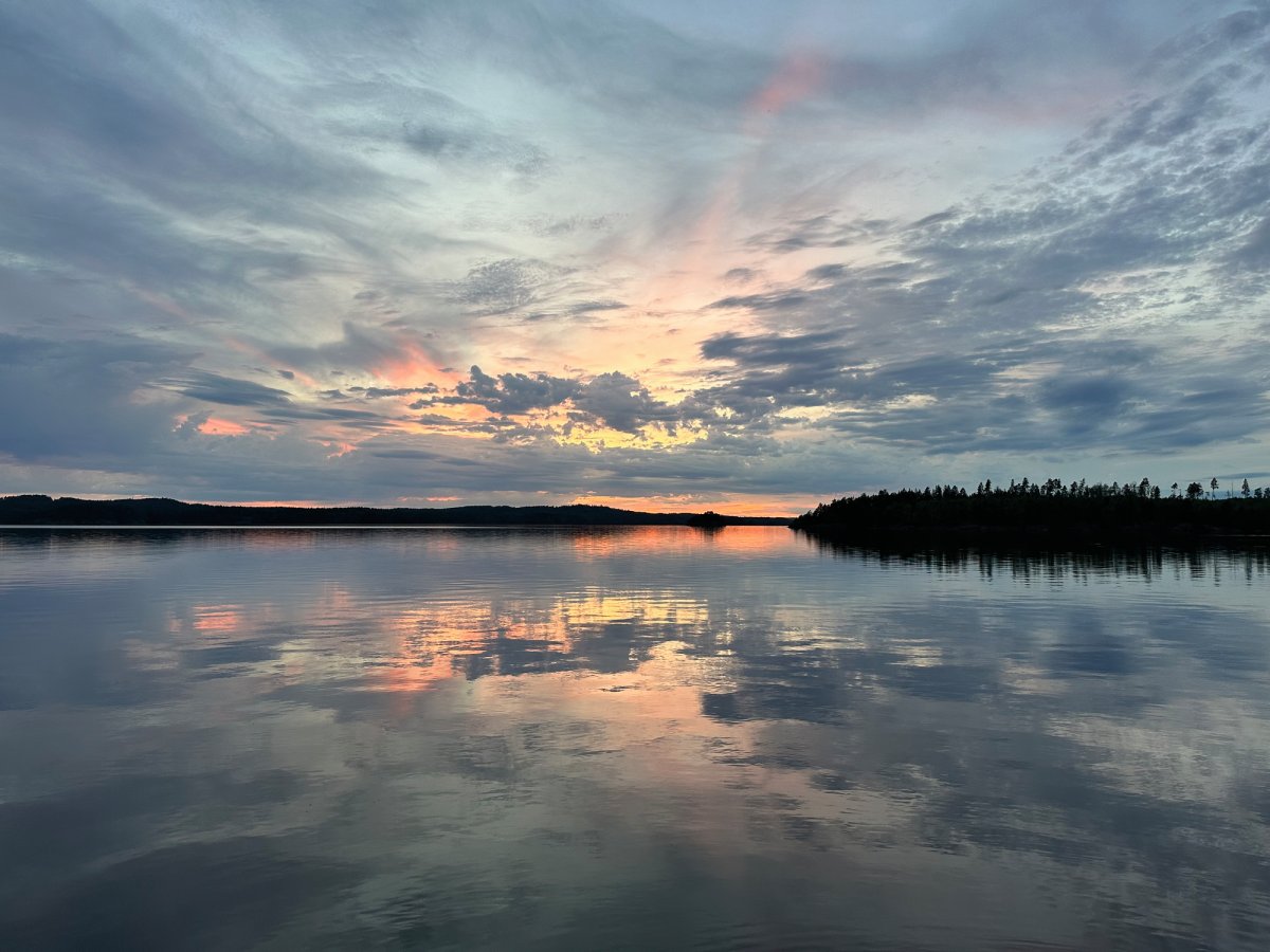 Am Abend sollte noch ein ganz besonderes Highlight auf uns warten. Wir beschlossen, noch einmal mit dem Kanu aufs Wasser zu fahren und den malerischen Sonnenuntergang zu erleben. Es war unser erster Sonnenuntergang auf dem See, und er schien fast wie eine Belohnung für die Geduld und das Abenteuer der vergangenen Tage. Die Spiegelung der untergehenden Sonne auf dem glatten Wasser ließ die Landschaft noch magischer wirken – die Silhouetten der Bäume, die sich im Abendlicht dunkel abzeichneten, die sanften Wellen, die sich kaum merklich bewegten, und der Himmel, der langsam in die Dunkelheit überging.