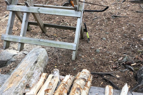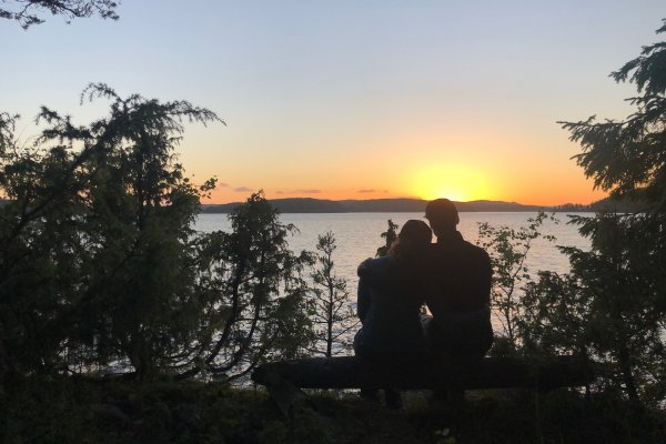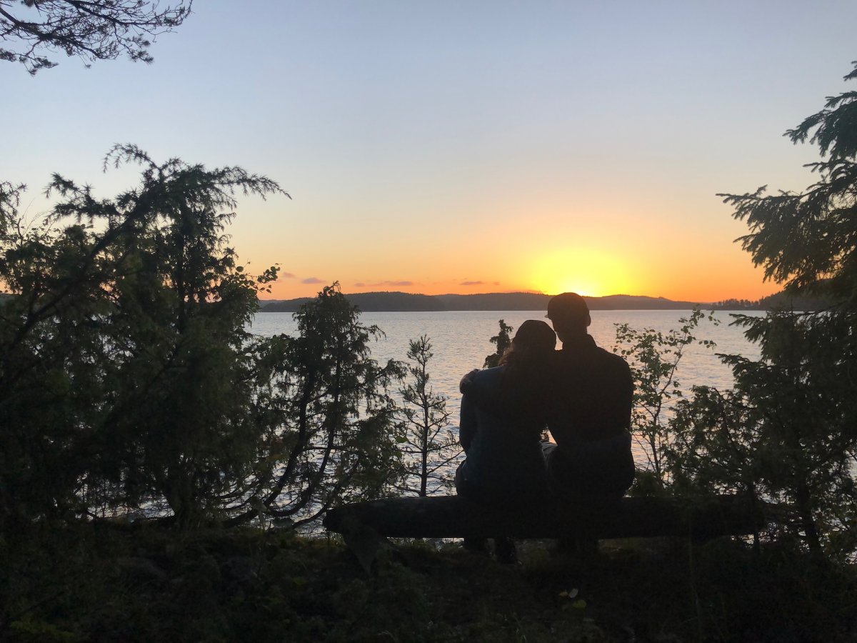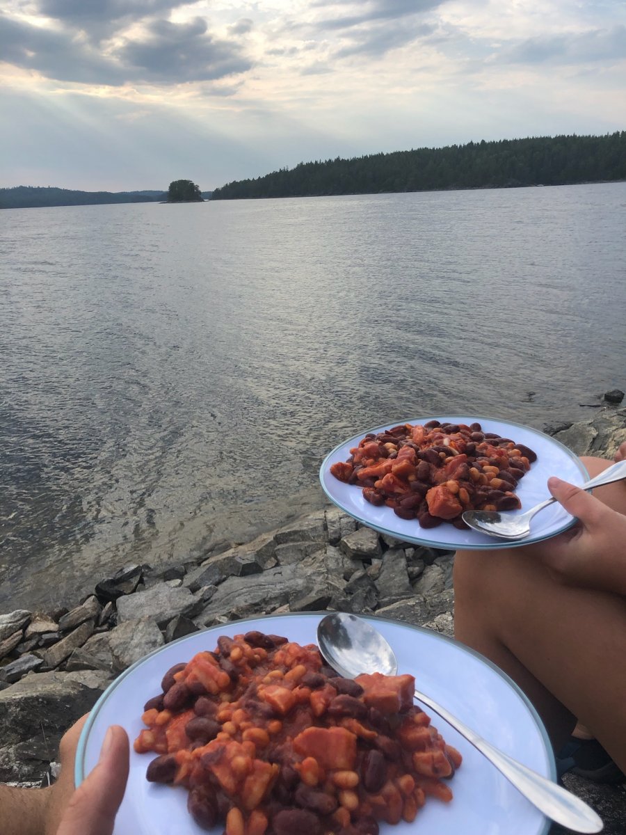 Gegen Abend war es zwar immer noch windig, doch die Wellen waren etwas niedriger, so dass wir uns auf die Suche nach einem geeigneten Lagerplatz machten. Da paddeln bei den Bedingungen ein echter Kraftakt war, wollten wir beim nächstbesten Lagerplatz das Zelt aufschlagen und kochen. Unsere Wahl fiel, nachdem wir aus dem Gebiet mit vielen Häusern und Privatbuchten draußen waren, auf ein kleines Waldstück. Dieser Lagerplatz war ganz anders als unsere vorherigen, urig und waldig. Man hatte zwar keinen Ausblick auf den See, doch man fühlte sich sehr mit der Natur verbunden. Ein echtes Erlebnis! Zu Abend gab es das unserer Meinung nach beste Gericht: Kartoffelgulasch mit Würstchen. Nach einem sehr anstrengenden Paddeltag und einem späten Lageraufbau genau das Richtige! Es wärmte von Innen raus und entschädigte uns für alle Strapazen des Tages. Auf einer selbst gebauten Bank mit Blick auf dem Sonnenuntergang konnten wir das Gulasch so richtig genießen.