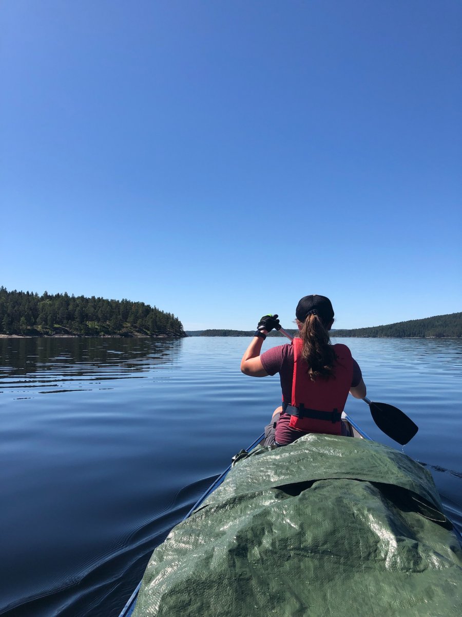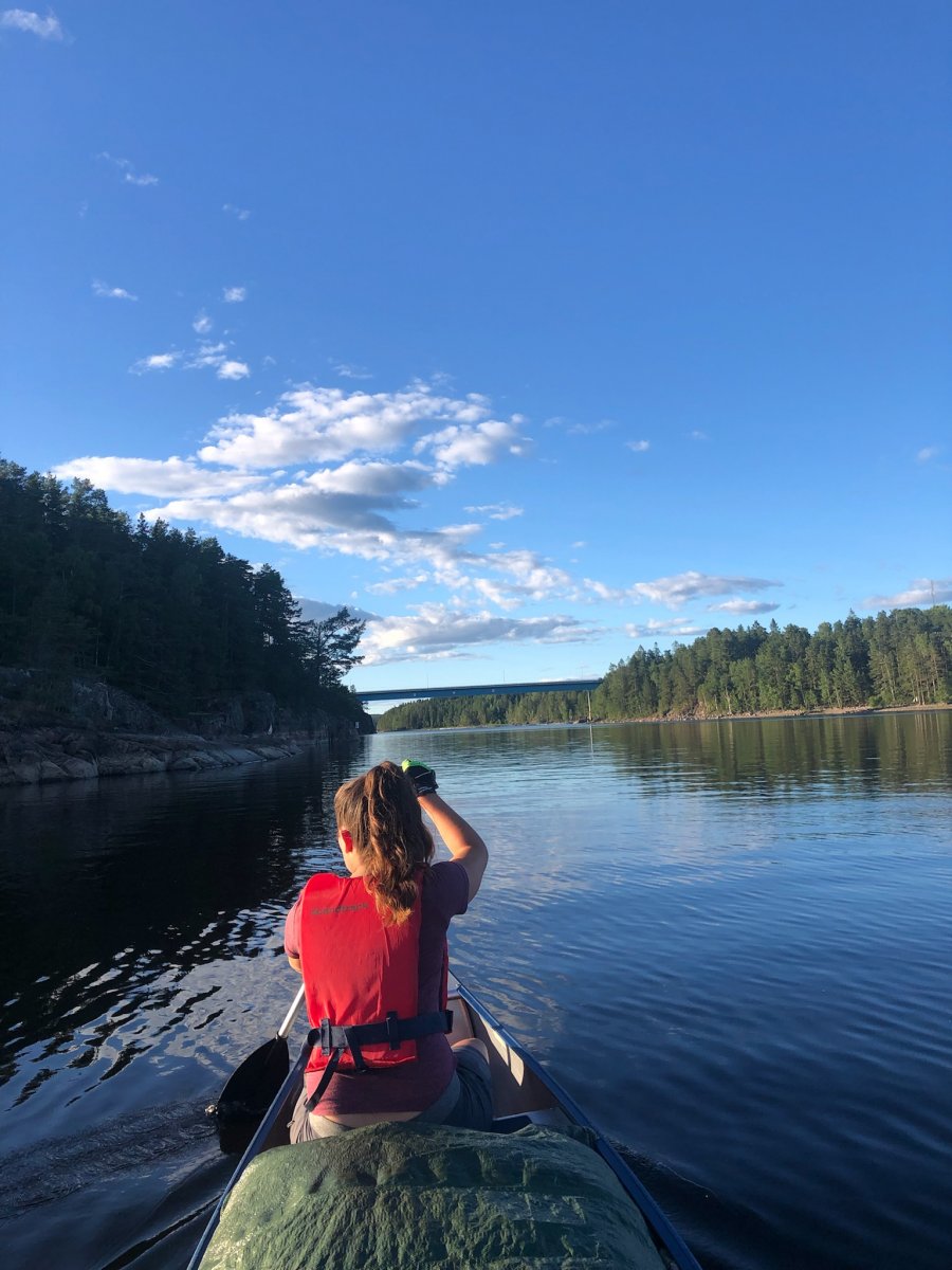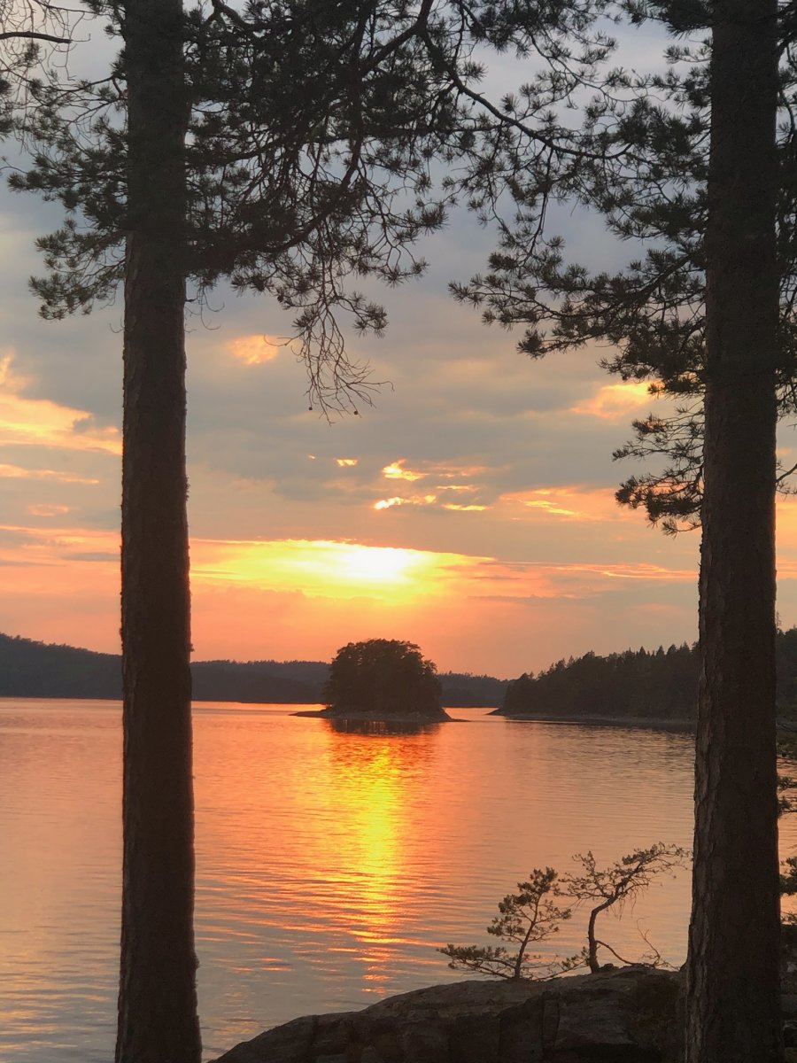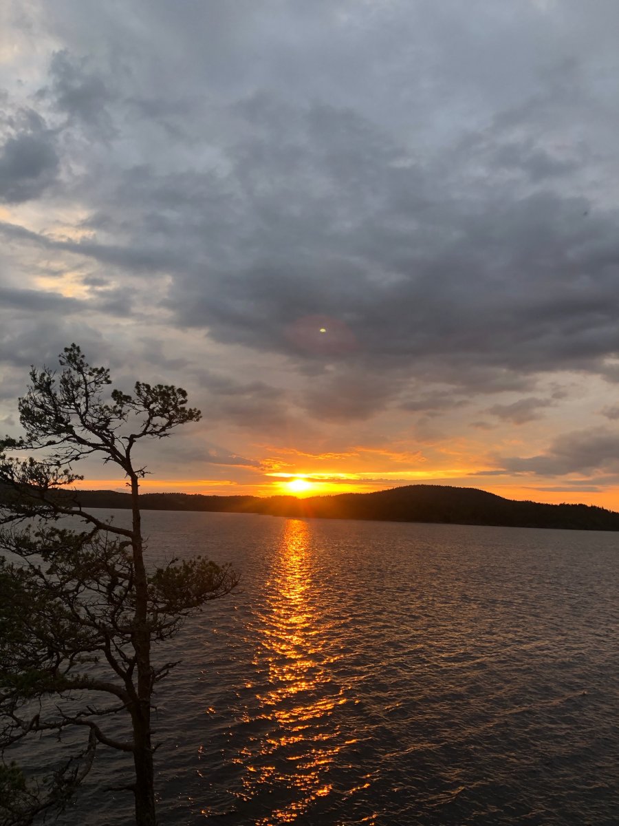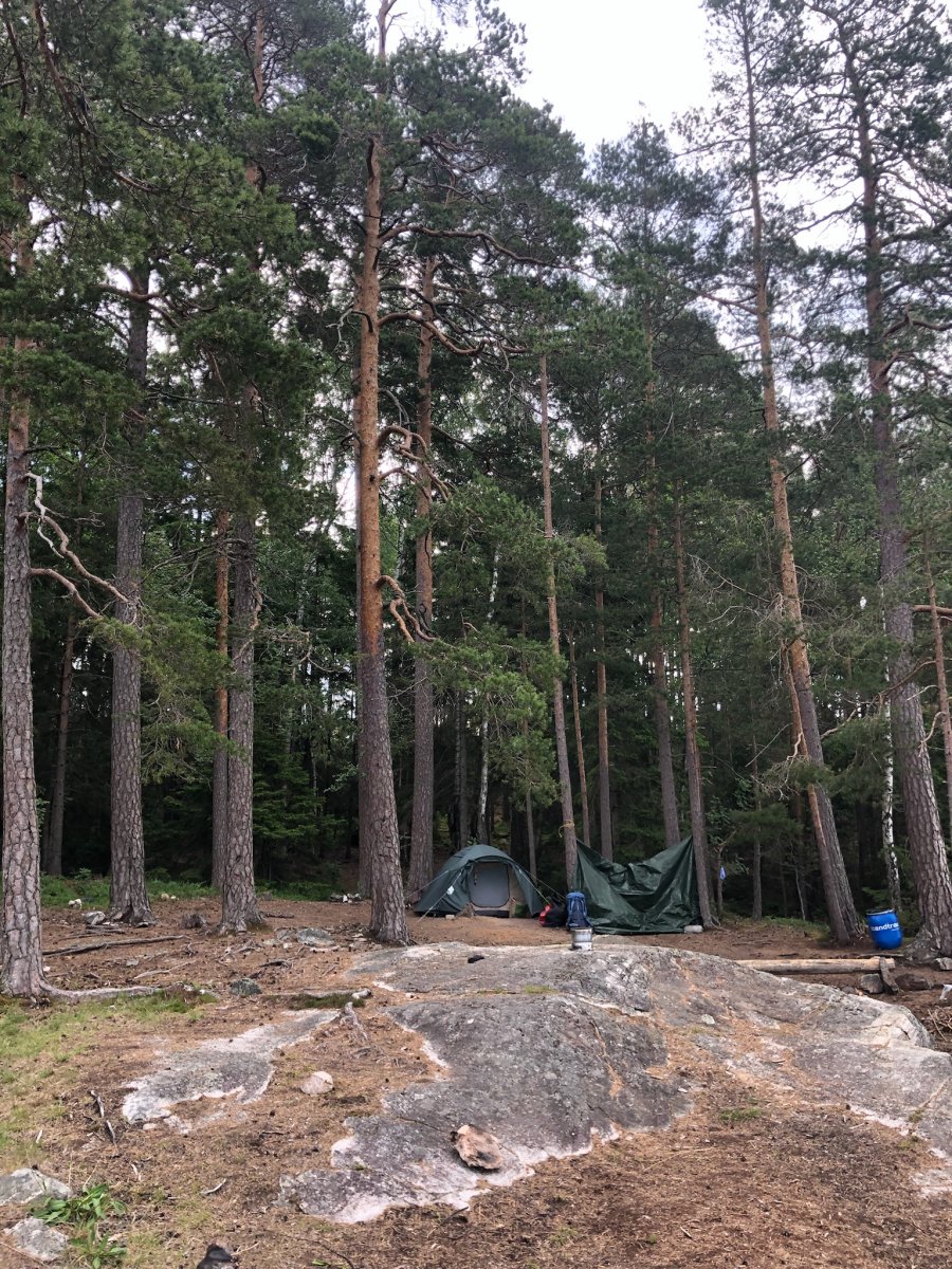 Scandtrack bietet die Möglichkeit umweltfreundlich mit einem Reisebus anzureisen. Doch da ich leider noch vor Abfahrt die letzte Prüfung meines Studiums bewältigen musste, sind wir nach den Bussen mit dem Auto losgefahren. Das Ziel war klar: Vor den prall gefüllten Reisebussen im Camp ankommen. Auf den Fähren sind wir einigen anderen aufgeregten Scandtrackern begegnet und tatsächlich sind wir vor den Bussen im Camp angekommen – und das sollte sich auszahlen! Die Ausgabe der Ausrüstung dauert selbst verständlich seine Zeit und wir hatten durch die 2 Wochen mehr Gepäck (beispielsweise zwei Essenstonnen), die wir zum Kanu tragen mussten. Aber durch die frühe Anreise, mussten wir nie lange in der Schlange stehen und waren schon vormittags auf dem Foxen und bereit für die ersten Abenteuer. Die richtige Paddeltechnik war schnell erprobt und so begannen wir den Foxen in Richtung Stora Lee zu erobern. Das Wetter war einfach traumhaft: blauer Himmel, spiegelglatter Foxen und an die 30 Grad. So durfte eine Pause auf einer kleinen Insel zum Eincremen und Snacken natürlich nicht fehlen! Unser Ziel für den ersten Tag war die „Grenzinsel“ auf der die Schwedisch-Norwegische Grenze verläuft und die zugleich auch die Grenze zwischen Foxen und Stora Lee bildet. Ursprünglich hatten wir angedacht, die erste Nacht an eine DANO zu verbringen, doch als das schwedische DANO schon besetzt war und wir auf der Suche nach dem norwegischen DANO waren, entdeckten wir eine traumhafte kleine Bucht mit Blick auf Norwegen. Sofort war klar: hier wollen wir bleiben! Der erste Lageraufbau dauerte eine Weile, doch die Scandtrack Zelte sind zum Glück selbsterklärend und simpel aufzubauen. Auch die Hängematte (starke Empfehlung!) haben wir zwischen zwei Bäumen am Ufer mit Blick auf See und den kommenden Sonnenuntergang aufgespannt. Den Rest des Tages standen lesen und im See Baden an, einfach herrlich! Doch das Wichtigste darf nie fehlen: die Erkundung der Umgebung! Aus anderen Reiseberichten wussten wir, dass auf der Grenzinsel auch ein Grenzstein steht. Bei einem kleinen Küstenspaziergang konnten wir ihn entdecken und zu ihm hochklettern. Von dort aus hatten wir eine schöne Aussicht und stellten fest – unsere erste Nacht verbringen wir in Norwegen und nicht wie gedacht in Schweden. Und auch das norwegische DANO konnten wir von hier entdecken, doch wir entschieden dennoch in unserer schönen Bucht zu bleiben. Zudem führt vom Grenzstein ein kleiner Weg quer über die Insel zum schwedischen DANO.