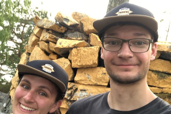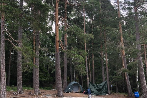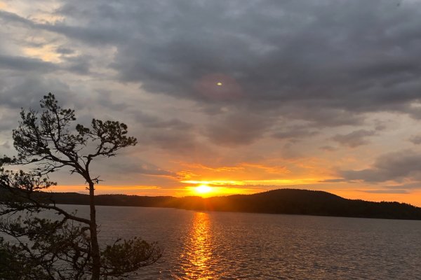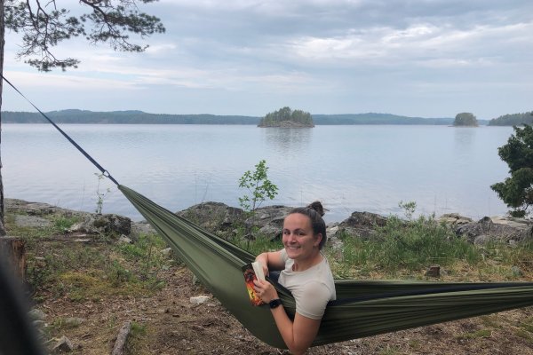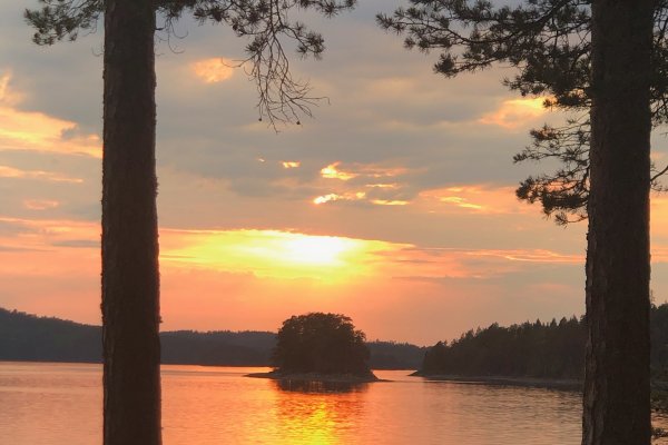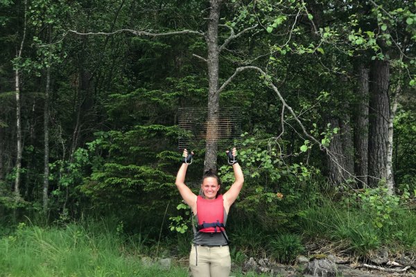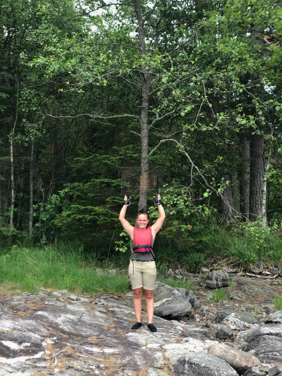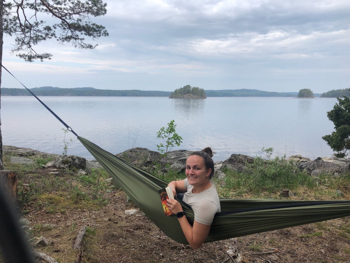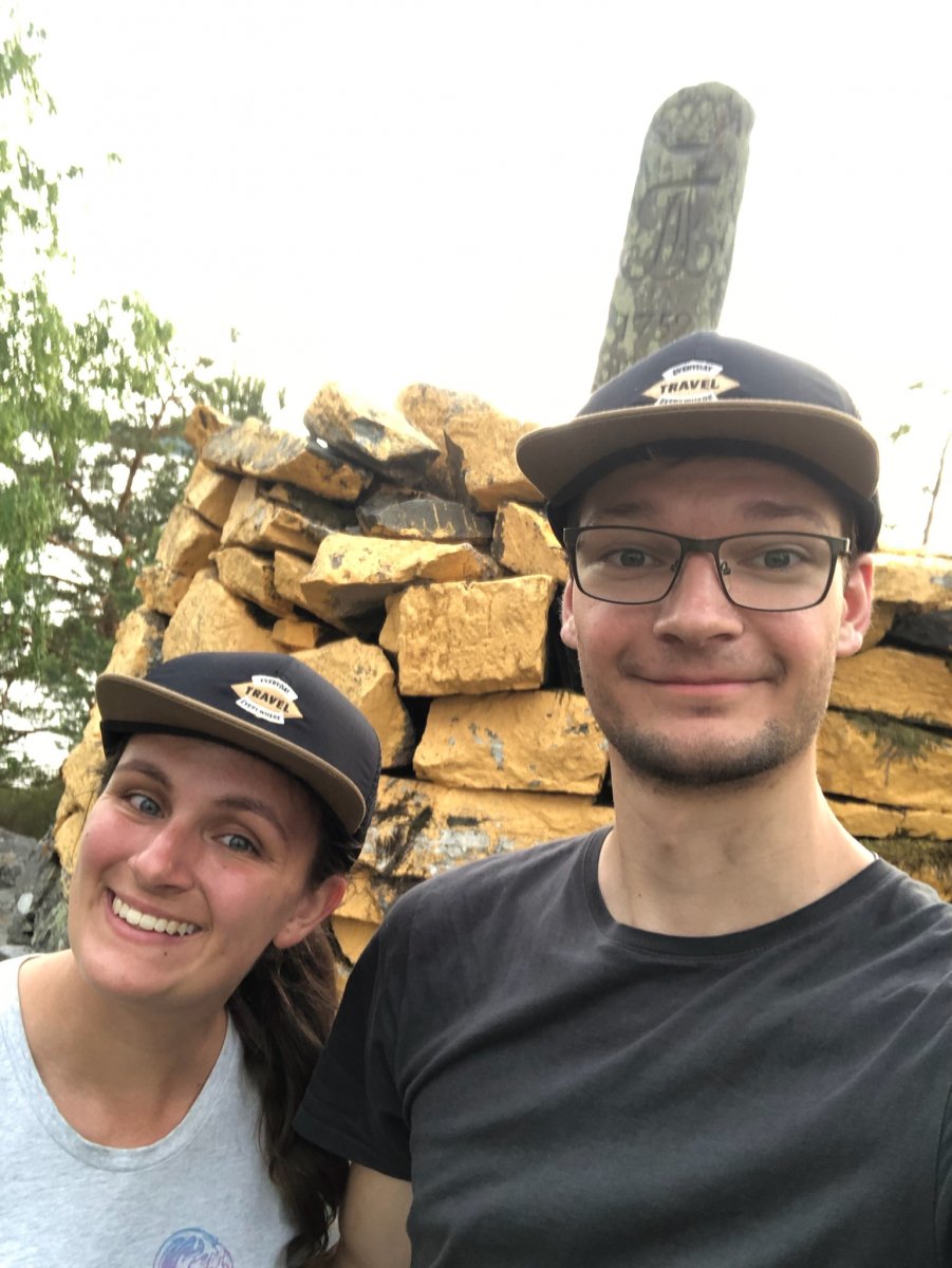 Scandtrack bietet die Möglichkeit umweltfreundlich mit einem Reisebus anzureisen. Doch da ich leider noch vor Abfahrt die letzte Prüfung meines Studiums bewältigen musste, sind wir nach den Bussen mit dem Auto losgefahren. Das Ziel war klar: Vor den prall gefüllten Reisebussen im Camp ankommen. Auf den Fähren sind wir einigen anderen aufgeregten Scandtrackern begegnet und tatsächlich sind wir vor den Bussen im Camp angekommen – und das sollte sich auszahlen! Die Ausgabe der Ausrüstung dauert selbst verständlich seine Zeit und wir hatten durch die 2 Wochen mehr Gepäck (beispielsweise zwei Essenstonnen), die wir zum Kanu tragen mussten. Aber durch die frühe Anreise, mussten wir nie lange in der Schlange stehen und waren schon vormittags auf dem Foxen und bereit für die ersten Abenteuer. Die richtige Paddeltechnik war schnell erprobt und so begannen wir den Foxen in Richtung Stora Lee zu erobern. Das Wetter war einfach traumhaft: blauer Himmel, spiegelglatter Foxen und an die 30 Grad. So durfte eine Pause auf einer kleinen Insel zum Eincremen und Snacken natürlich nicht fehlen! Unser Ziel für den ersten Tag war die „Grenzinsel“ auf der die Schwedisch-Norwegische Grenze verläuft und die zugleich auch die Grenze zwischen Foxen und Stora Lee bildet. Ursprünglich hatten wir angedacht, die erste Nacht an eine DANO zu verbringen, doch als das schwedische DANO schon besetzt war und wir auf der Suche nach dem norwegischen DANO waren, entdeckten wir eine traumhafte kleine Bucht mit Blick auf Norwegen. Sofort war klar: hier wollen wir bleiben! Der erste Lageraufbau dauerte eine Weile, doch die Scandtrack Zelte sind zum Glück selbsterklärend und simpel aufzubauen. Auch die Hängematte (starke Empfehlung!) haben wir zwischen zwei Bäumen am Ufer mit Blick auf See und den kommenden Sonnenuntergang aufgespannt. Den Rest des Tages standen lesen und im See Baden an, einfach herrlich! Doch das Wichtigste darf nie fehlen: die Erkundung der Umgebung! Aus anderen Reiseberichten wussten wir, dass auf der Grenzinsel auch ein Grenzstein steht. Bei einem kleinen Küstenspaziergang konnten wir ihn entdecken und zu ihm hochklettern. Von dort aus hatten wir eine schöne Aussicht und stellten fest – unsere erste Nacht verbringen wir in Norwegen und nicht wie gedacht in Schweden. Und auch das norwegische DANO konnten wir von hier entdecken, doch wir entschieden dennoch in unserer schönen Bucht zu bleiben. Zudem führt vom Grenzstein ein kleiner Weg quer über die Insel zum schwedischen DANO.