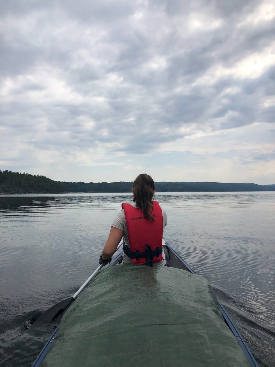 Nun stand die Rück-Überquerung des Stora Lee an, da wir ja auch die andere Uferseite sehen wollten. Da die Bedingungen dafür nicht ideal waren durch den starken Gegenwind, paddelten wir zunächst noch ein wenig nordwärts, bis wir eine der schmalsten Stellen des Stora Lees erreichten. Hier kämpften wir uns auf die andere Seite, auf der sich ein Naturreservat bestehend aus vielen Inseln befand, welches wir versuchten als Windschutz zu nutzen. Als wir das Naturreservat hinter uns gelassen hatten, wollten wir an einer Insel eine kurze Pause machen. Doch da passierte das Unglück, ein Stechviech flog gegen mein Augenlid. Ich bemerkte keinen Stich, so dass wir nach der kurzen Pause weiter paddelten. Doch auf dem Wasser schwoll mein Augenlid an und ich konnte immer schlechter sehen. Der starke Wind verbesserte die Situation nicht gerade. Zum Glück fanden wir schnell einen Lagerplatz und ich legte mich zügig ins windgeschützte Zelt. Gerade als wir überlegten, ob ich wegen meiner allergischen Reaktion ins Krankenhaus nach Ed müsste, schritt die Schwellung nicht mehr weiter voran. Nochmal Glück gehabt. Dennoch war unser Kanu Tag hiermit beendet, da ich mit einem stark geschwollenen Augenlid nicht gut genug sehen konnte.