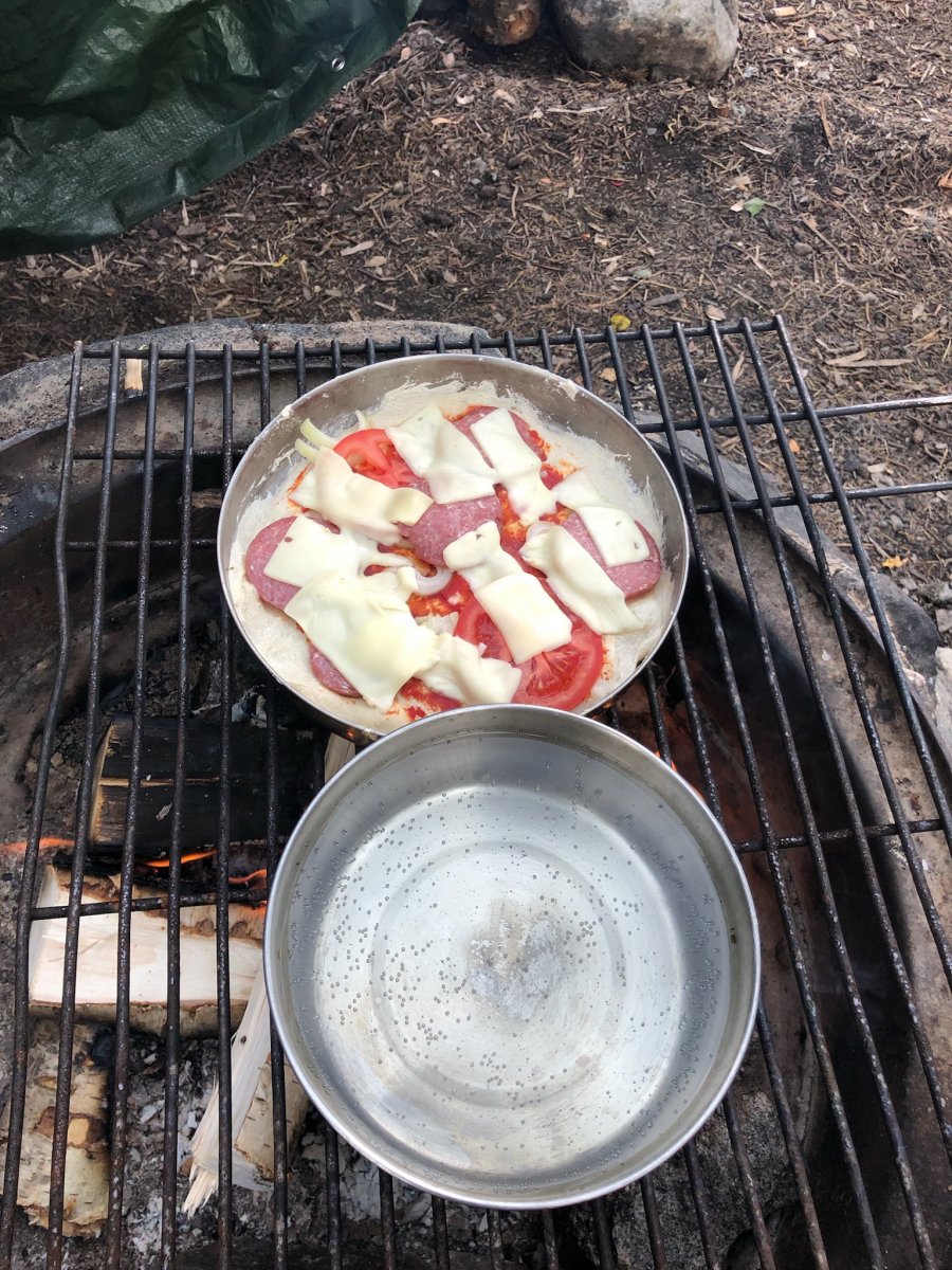 Gegen Mittag kamen wir an eine breite Stelle des Stora Lees in dessen Mitte eine Insel thronte. Und laut Karte sollte sich auf dieser ein DANO befinden – perfekt für einen Gewitterabend! Bei unserer Ankunft war der Himmel noch blau und der Foxen glatt. Da gerade eine Gruppe ging, hatten wir das DANO zunächst für uns! So verbrachten wir den Rest des herrlichen Tages mit dem Hacken von Feuerholz, baden und (leider erfolglosem) Angeln. Da wir am DANO eine Feuerstelle hatten, wollten wir unbedingt die Outdoorpizza probieren! Doch leider fing es, als das Feuer gerade brannte, an heftig zu regnen, so dass die Pizza nicht so richtig durch werden wollte. Dennoch war es sehr lecker und ein lustiger Abend, den wir mit 2 Kajakern im DANO verbrachten.