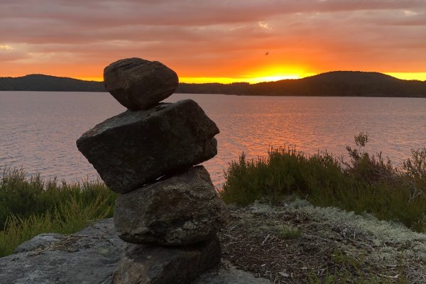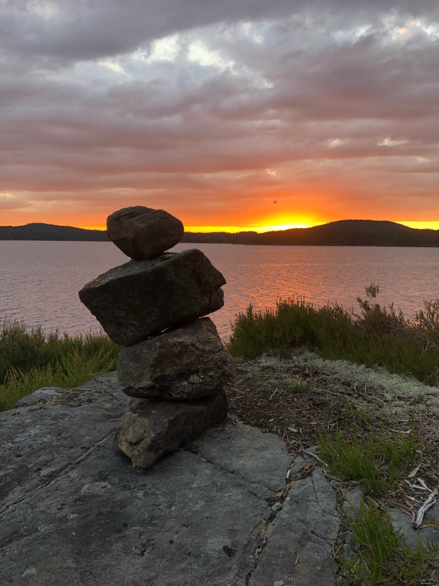 Nach der Fähre wurde es etwas besser, doch der Wind und die Wellen drückten uns in eine Bucht hinein und es wurde klar, dass wir hier rasten müssen – gegen die Wellen hatten wir mit dem Kanu keine Chance mehr! In 2 Stunden hatten wir gerade einmal knapp über einem Kilometer geschafft. Die Bucht schien privat zu sein, doch wir hatten keine Wahl und waren auch weit von Häusern entfernt. Zudem sollte es ja nur ein kleiner Stopp sein, bis wir wieder aus der Bucht hinauskonnten. Doch schließlich verbrachten wir den gesamten Nachmittag in der Bucht, aßen unsere Lunchpakete, bauten Steintürme und sprachen in der Sonne über Gott und die Welt.