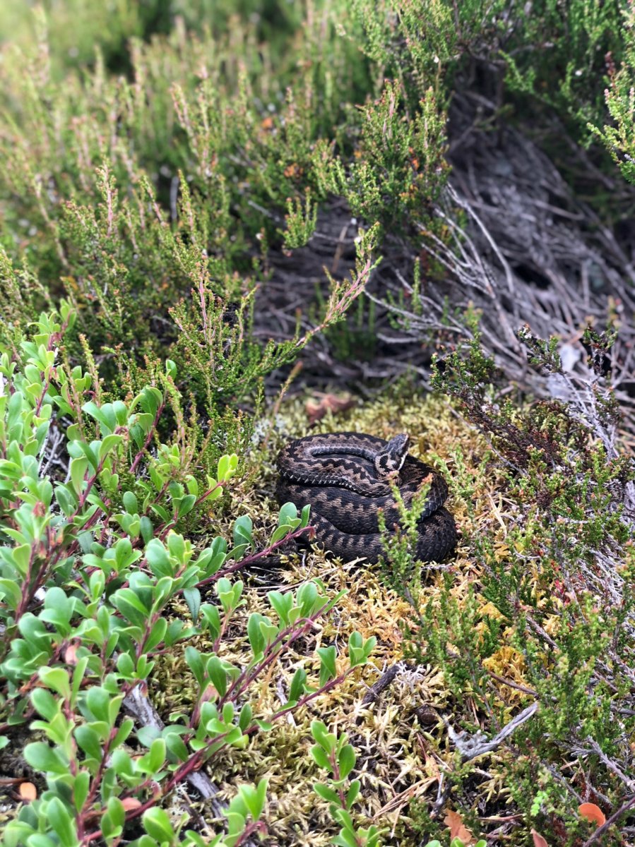 Am nächsten Morgen hatte der Wind ein Wenig nachgelassen. Keine idealen Kanu Bedingungen, aber das sollte uns nicht aufhalten. Beim Beladen des Kanus entdeckte ich etwas Großes auf den Steinen: eine Schlange! Und dieses Mal war es keine Ringelnatter, sondern eine Kreuzotter! Diese ist laut Google „in den meisten Fällen nicht lebensbedrohlich“. Aber da gerade Brutzeit war, machten wir lieber einen großen Bogen um sie. Auch wenn ich Angst vor Schlangen habe, war es doch faszinierend die Kreuzotter aus sicherer Entfernung zu beobachten und zu fotografieren. Dennoch war ich sehr froh, sie erst beim Verlassen des Lagerplatzes bemerkt zu haben! Sonst hätte ich in der Nacht wohl kaum ruhig geschlafen.