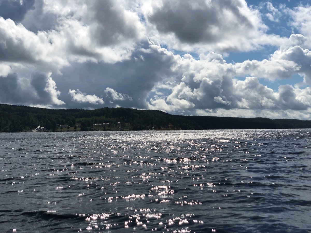 Auch der nächste Morgen begrüßte uns Schweden mit traumhaftem Wetter, so dass wir es nicht eilig hatten, unseren schönen Lagerplatz zu verlassen. Die ersten Meter im Kanu liefen wie gewohnt super, doch bald zog starker Gegenwind auf. Das Problem: die Insel mit dem DANO hatte mitten auf dem See gelegen, so dass uns der Wind mit den Wellen in großer Entfernung zum Ufer erreichten. Mühsam, aber entschlossen kämpften wir uns Richtung Ufer. Doch so schnell wollten wir uns nicht geschlagen geben und wir entschlossen uns, zumindest die Fähre bei Nössemark zu überqueren. Leider wurden die Wellen durch den Wind immer höher und es bildeten sich immer mehr Schaumkronen. So langsam kam ein mulmiges Gefühl auf… Was machen wir eigentlich, wenn wir kentern? Und können überhaupt alle unsere Sachen schwimmen…?