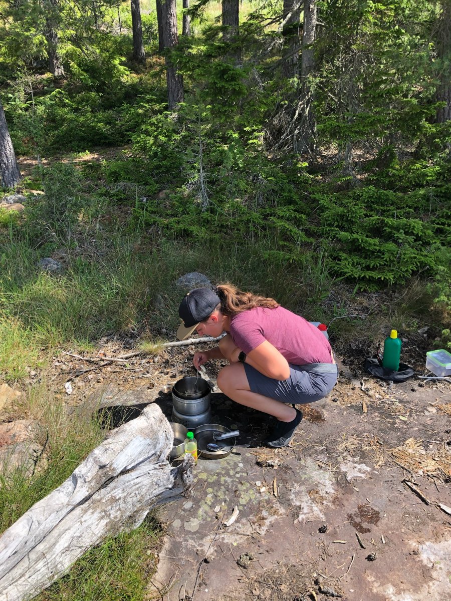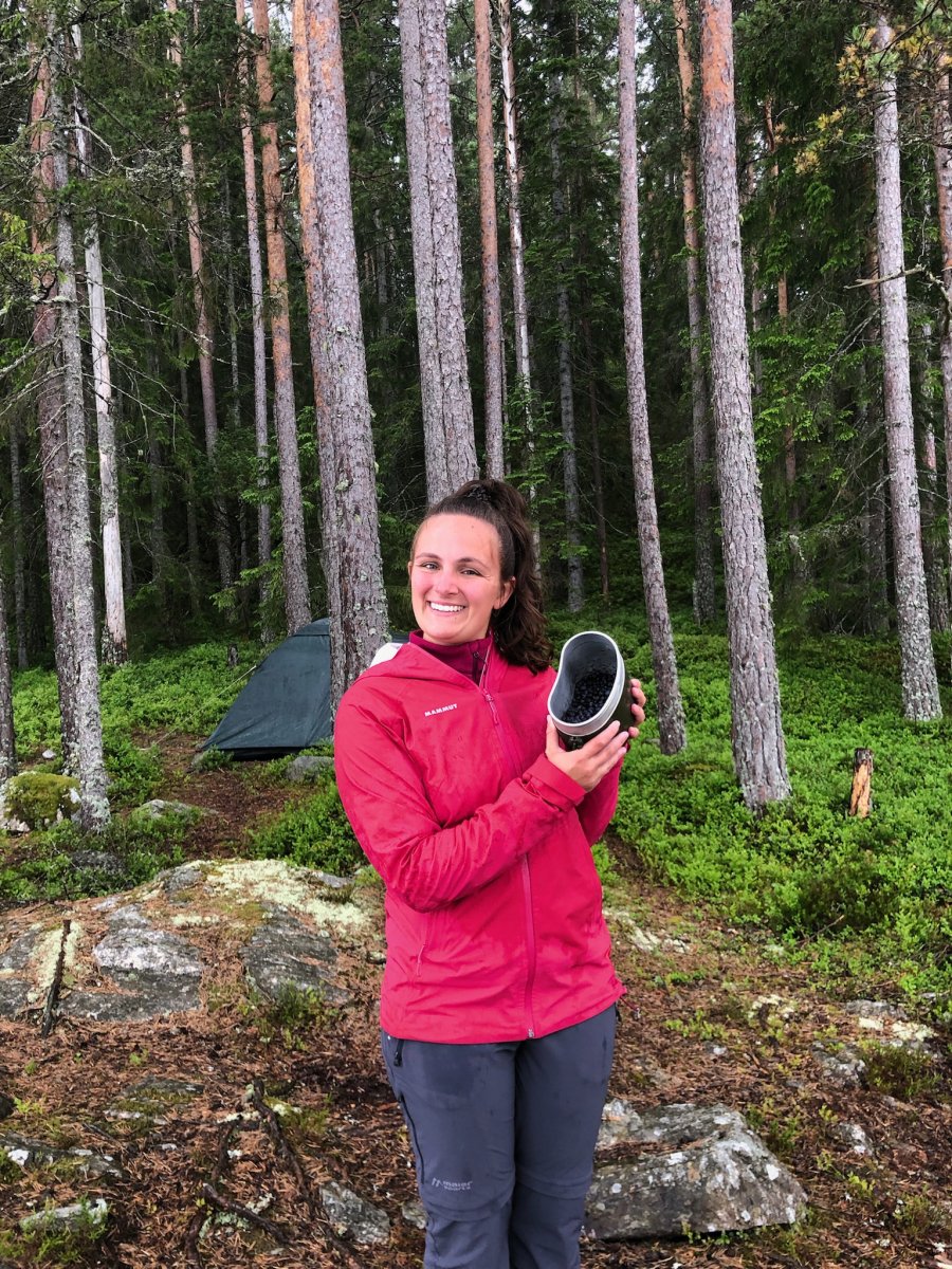 Zurück auf dem Foxen entdeckten wir Inseln mitten auf dem See und beschlossen, dass wir unser Lager gerne auf einer davon aufschlagen würden. Letztlich wurde es die größte der Inseln, da die anderen Vogelschutzinseln waren. Später stellte sich heraus, dass unsere große Insel bei Scandtrackern unter vielen Namen bekannt ist, darunter „Ameisen-Insel“ und „Blaubeeren-Insel“. Glücklicherweise ließen sich bei uns keine Ameisen blicken, dafür aber umso mehr Blaubeeren. Da wir jedoch bereits eine Blaubeeren-Insel hatten, wurde diese Insel für uns zu der „großen Insel“, was auch der Übersetzung ihres schwedischen Namens entspricht. Unser Camp errichteten wir auf der Nordspitze der Insel mit traumhaftem Ausblick auf den Foxen. Voller Enthusiasmus füllten wir unsere Blaubeervorräte wieder auf. Dabei machten wir gleichzeitig einen langen Spaziergang zur Südspitze auf kleinen Pfaden zwischen den Blaubeersträuchern. Schnell stand fest: Heute gibt es Blaubeer-Pancakes! Nach anfänglichen Schwierigkeiten sind diese sehr lecker geworden! Hätten die 7 vs. Wild Teilnehmer, doch auch Mehl und Zucker dabei gehabt…