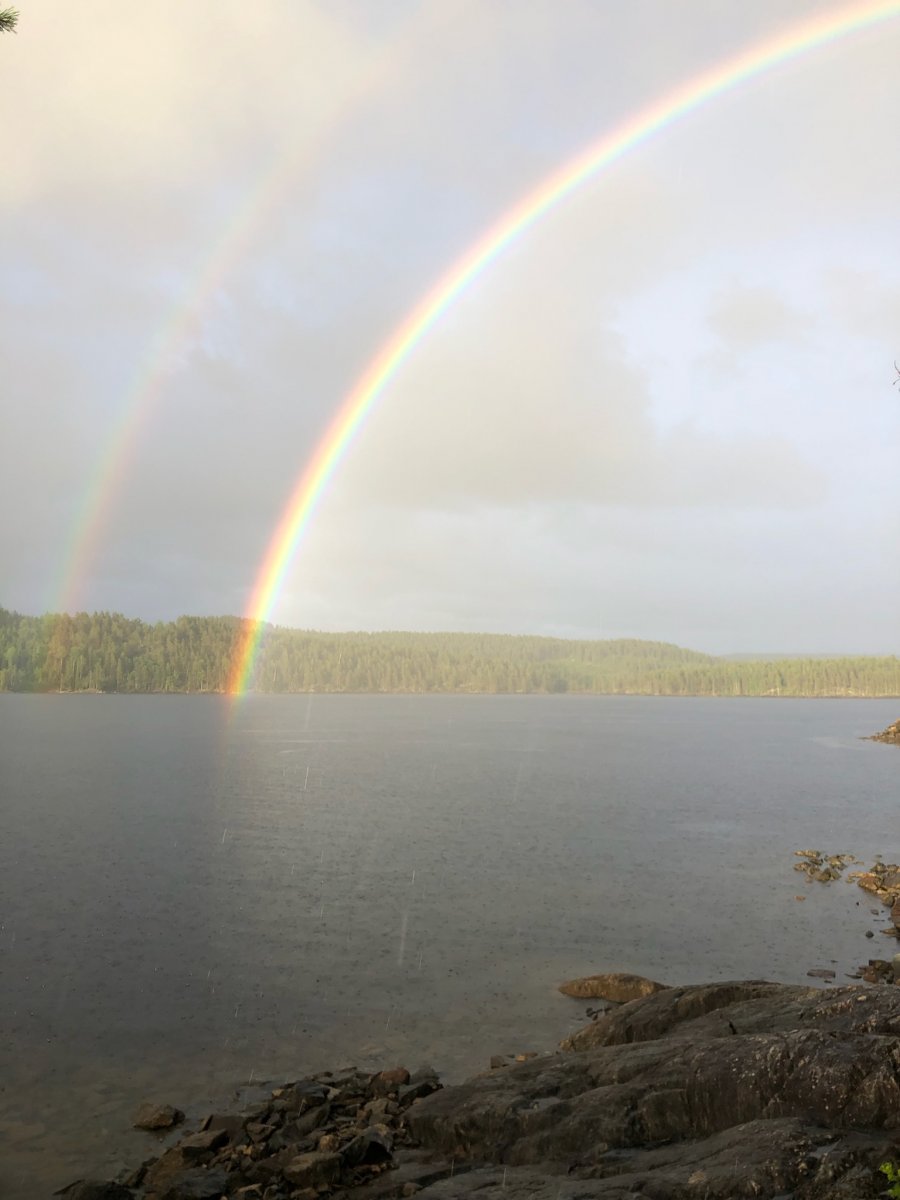 Abends kochten wir im Regen den Jägerbraten und hatten dabei den Spaß unseres Lebens. Und auf den Regen folgte, als wir gerade beim Essen waren, nicht nur ein Regenbogen, sondern gleich zwei. Passend zu 2 vs Wild! Und wie schon zuvor gesagt, Schweden entschädigte uns immer für alle Strapazen: Ein Tag gestrandet und danach eine allergische Augenlidschwellung? Dafür bekommt ihr Massen an Blaubeeren und gleich zwei Regebögen. Man muss nur immer alles positiv sehen und in der Lage leben.
