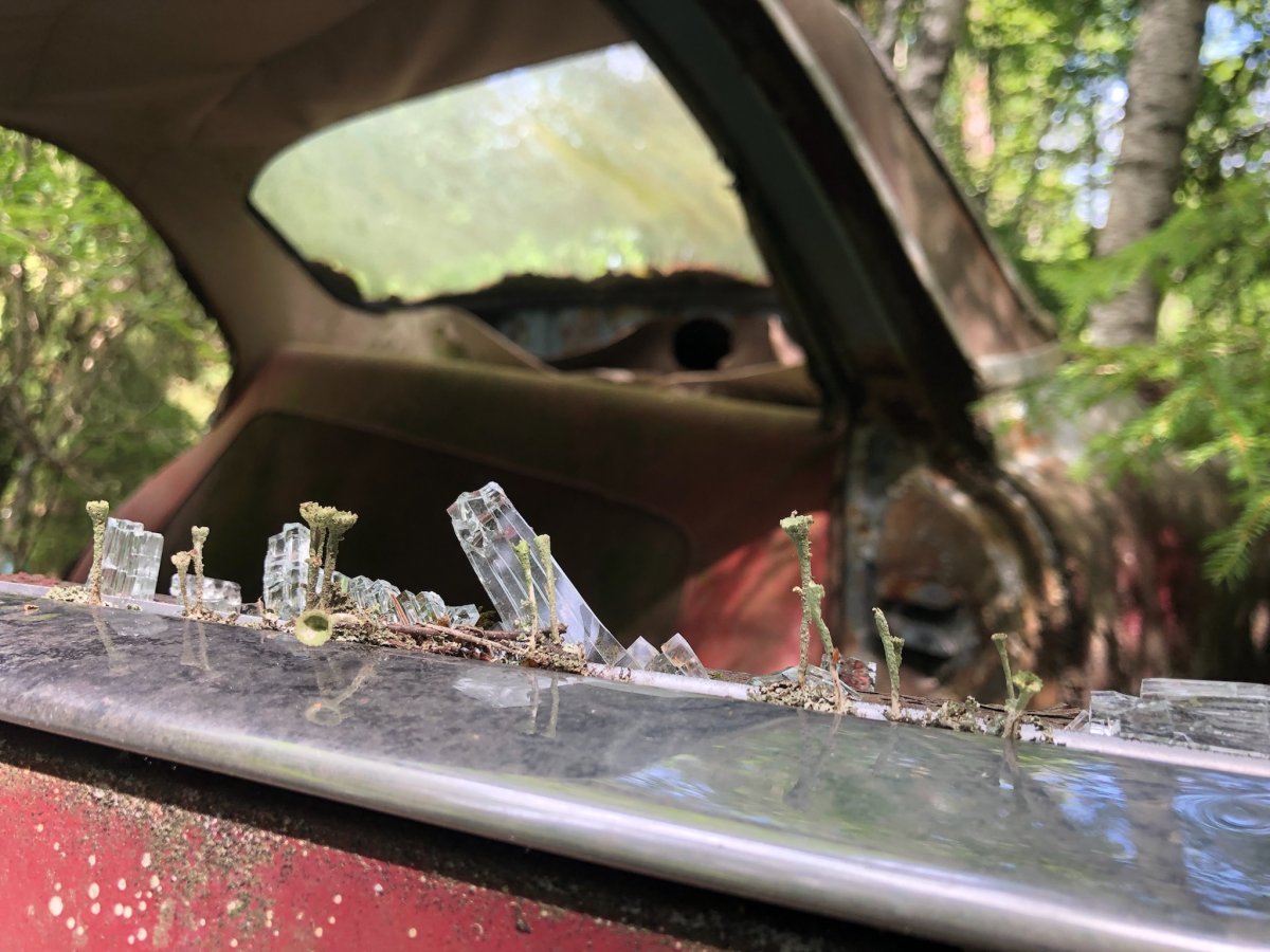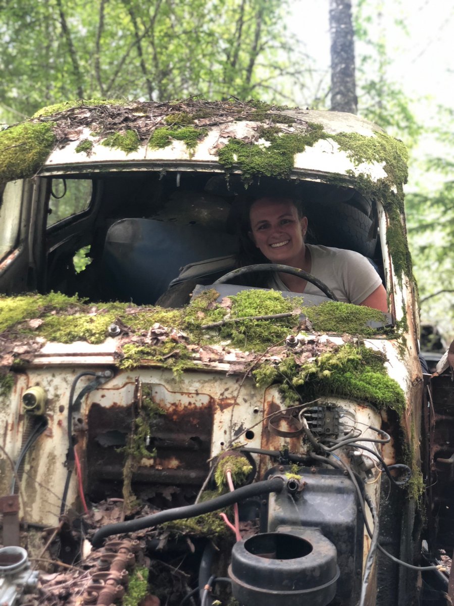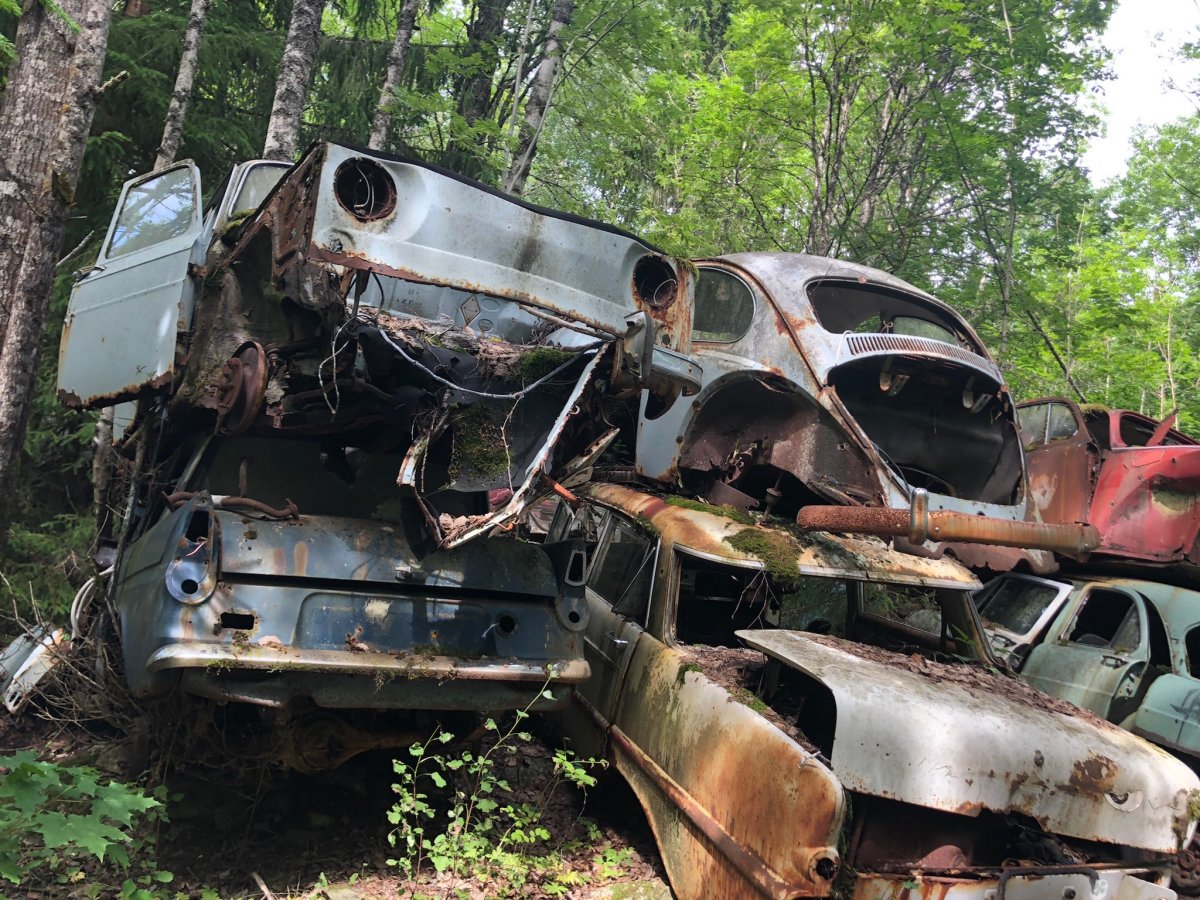 Für unsere heutige Mittagspause hatten wir ein ganz besonderes Ziel: den Autofriedhof von Bastnäs. Diesen erreicht man über einen kleinen Weg, der auch auf der Karte verzeichnet ist. Mittlerweile ist der Autofriedhof leider kein Geheimtipp mehr, dennoch sollte man sich dieses Erlebnis keinesfalls entgehen lassen! In den 1950er und 1960er Jahren schmuggelten zwei Brüder Autos nach Norwegen, indem sie diese auf dem Autofriedhof zerlegten und die Einzelteile in Norwegen wieder zusammenbauten. Als sich das Geschäft nicht mehr lohnte, ließen sie einfach alles zurück. Nun türmen sich mitten im Wald hunderter, wenn nicht gar tausende Oldtimer. Und die Natur erobert sich die Fläche Stück für Stück zurück! Ein spannendes Mahnmal zum Thema Natur und Vergänglichkeit, das nebenbei ein tolles Fotomotiv bietet.