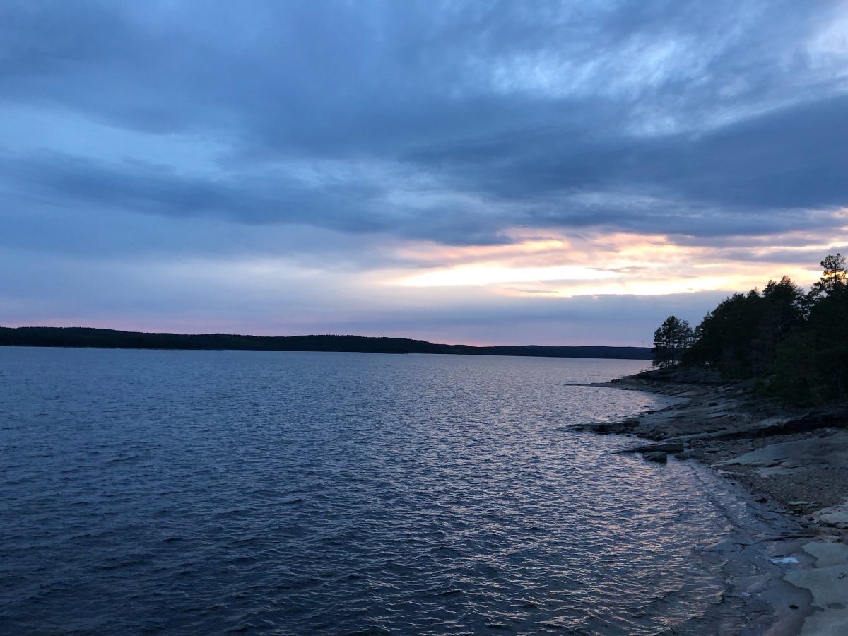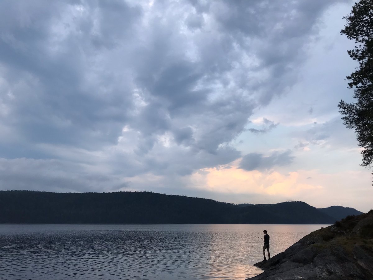 Uns so kam es, dass wir gegen 18h in unser Kanu stiegen und Kurs auf Töcksfors nahmen. Leben in der Lage! Vor Töcksfors gibt es einiges zu entdecken, beispielsweise eine alte Kirche und eine hübsche Brücke. Nach der Brücke wollten wir uns auf einer der Inseln einen Lagerplatz suchen, doch dann geschah es: Um uns herum sprangen Fische aus dem Wasser! Schnell die Angel zusammengebaut, denn es handelte sich vermutlich um eine Barschjagd. Doch vielleicht hatten wir den falschen Köder, vielleicht waren die Barsche noch zu klein oder wie waren schlicht unfähig. Es wollte einfach kein Fisch anbeißen. Vermutlich hätten wir mit bloßen Händen mehr Erfolg gehabt, es war als wollten die Fische uns auslachen! Nach einer Stunde fehlgeschlagener Versuche setzten wir die Suche nach einem Lagerplatz fort. Alle DANOs waren bereits besetzt und in der Nähe der Ortschaft sind wilde Spots rar. So war es kurz vor Mitternacht, bis wir endlich unser Lager aufschlugen, nachdem wir die Inselgruppe komplett umrundet hatten. Zu Abend gab es dann noch ein leckeres Blaubeerkompott, bevor wir erschöpft ins Zelt gingen.
