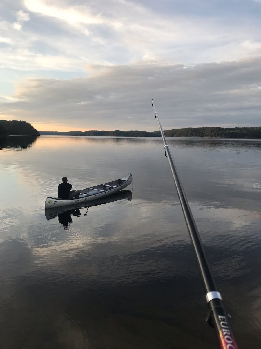 Zurück auf dem Wasser warf Moritz hinten im Kanu die Angela aus. Wir waren kaum einen Meter gepaddelt, da schrie er überrascht auf! Hatten wir etwas an der Angel? Hastig zog er die Leine an und tatsächlich: Unter der Wasseroberfläche erkannten wir einen etwa 25cm großen Barsch! Jedoch waren wir selbst so überrascht über den plötzlichen Fang und zogen die Angel nicht weiter an. Das nutzte der Barsch und riss sich los. Dennoch waren wir begeistert endlich einen Fisch gefangen zu haben. Und zugleich für immer eine Anekdote über unser tölpelhaftes Angelverhalten zu haben! Danach, als wir vorbereiteter waren, wollte selbstverständlich kein Fisch mehr anbeißen.