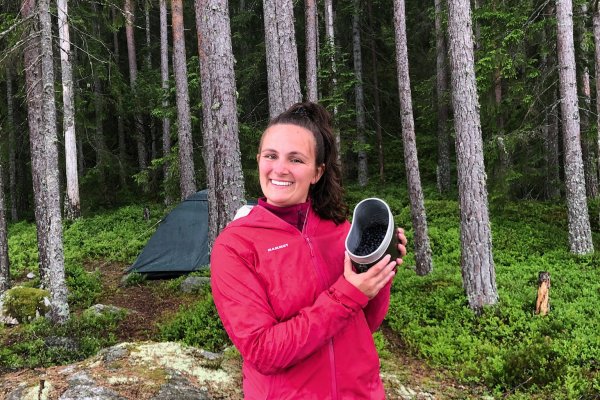 Gute Nachrichten: An Tag 10 erwartete uns kein starker Gegenwind und auch mein Augenlid war etwas weniger stark geschwollen. Wir waren bereit für die nächsten Abenteuer. Es ist erstaunlich, wie viel schneller man vorankommt, wenn man nicht gegen den Wind kämpfen muss! Das erlebten wir, als wir an der Fähre bei Nössemark und der Insel mit dem ersten DANO, bei dem wir gezeltet hatten, vorbei paddelten. Dieses Mal war die Strecke kein Problem und schnell geschafft, so dass wir die Fähre auch tatsächlich bewundern konnten. Nach einer Pause an einem kleinen Strand paddelten wir weiter Richtung Foxen. Jedoch schlugen wir bald auf einer Insel unser Lager auf, da für den Nachmittag Regen angesagt war. Nach dem Zeltaufbau erwartete uns eine Überraschung: An den Pflanzen am Boden wuchs etwas: Blaubeeren! In der letzten Juni Woche hatten wir noch keine finden können, doch durch den Regen im Juni waren sie nun im Juli reif! Und überall waren etliche Sträucher zu sehen, die voller Blaubeeren hingen! Etwa 2 Stunden lang sammelten wir begeistert Blaubeeren und naschten auch schon die ein oder andere. Herrlich! Und was man damit alles anstellen kann: Das Scantrack Outdoor Kochbuch gibt dafür einiges her: Heidelbeeren Pancakes, Kompott, Kuchen, usw. So haben wir uns das Outdoor-Leben vorgestellt! Wenn schon kein Fisch anbeißen wollte, so hatten wir dafür nun in Massen selbst gesammelte Blaubeeren.