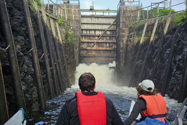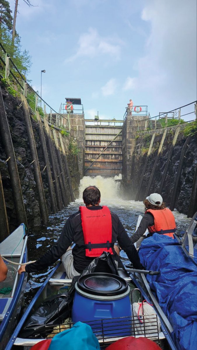 Gestartet sind wir mittags von Höglund aus. Unser erstes Ziel war das Überstehen der Schleuse in Lennartsfors. Nachdem wir erstmal ein bisschen hilflos waren, hat uns die sehr freundliche Schleusenwärterin auf dem Weg durch die drei Kammern unterstützt – zum acht Meter tiefer gelegenen Lelång-See.