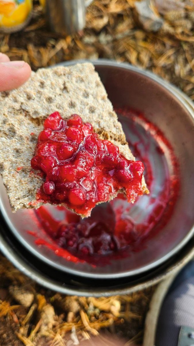 Mit kurzer Stippvisite im Skandtrack-Basecamp in Höglund ging es nun zu einem neuen großartigen Anblick: Dem insel- und buchtenreichen Foxen-See. Unsere Lagerplatz-Scouting-Tour war die bis dato wildeste. Starker Wind und hohe Wellen haben es im Boot zu einer relativ feuchten Angelegenheit gemacht. Aber der Aufwand hat sich gelohnt! Meine reichhaltige Preiselbeer-Ernte habe ich in einem kurzen Kreativitätsanflug zu Marmelade verarbeitet – eins meiner absoluten Highlights.