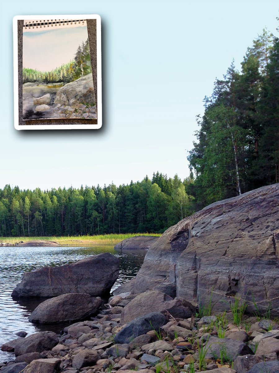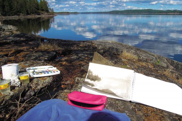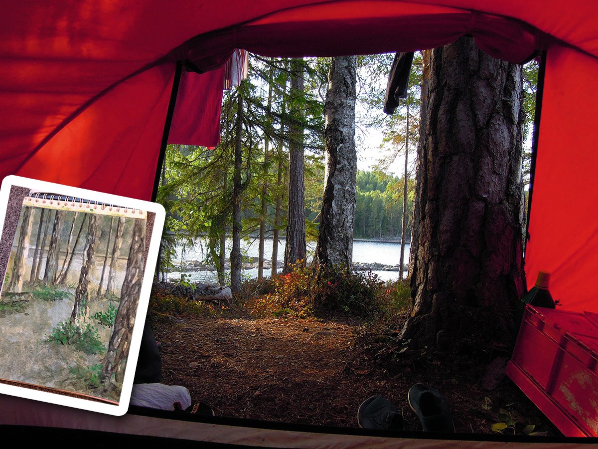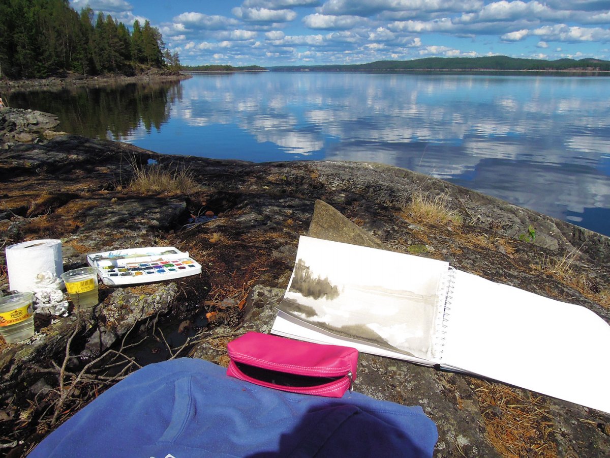 Wir überquerten den Foxen dann vor Sundsbyn und fuhren im Anschluss am Westufer nach Süden, was uns vor allem in Höhe von Risön noch ein paar traumhafte Plätze bescherte, an denen wir die rar gewordenen aber bisweilen dennoch vorhandenen Sonnenstunden genossen. Auch hier entstanden ein paar schöne Aquarelle und wir erlebten so einige beeindruckende Momente, wie z.B. eine Nebelwand die zur frühen Morgenstunde über den Foxen zog, was sich leider nicht so recht fotografisch festhalten ließ. Allein der Anblick war aber atemberaubend. Mittlerweile war auch das Feuerverbot aufgrund der regenreichen Nächte gelockert, sodass wir endlich wieder heißen Kaffee und vor allem warme Mahlzeiten genießen konnten.