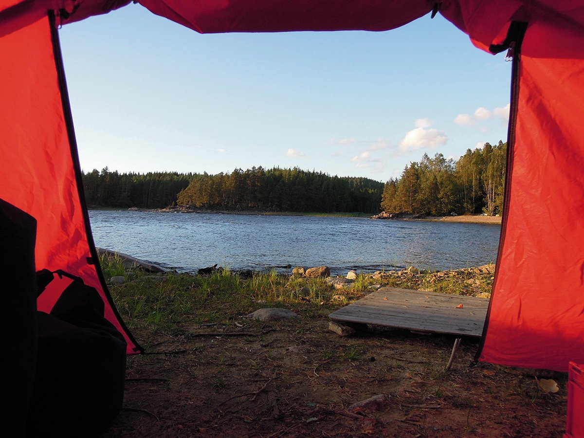An diesem idyllischen Lagerplatz mit Blick aufs schwedische Hinterland, entstanden dann am nächsten Morgen auch die ersten Aquarellzeichnungen, bevor es mit unserer grob geplanten Route weiterging. Wir fuhren in kleineren Etappen nordwärts am Ostufer des Foxens entlang. Dabei probierten wir uns die ersten Tage quer durch die Essenstonnen an allem möglichen, was man ohne Kochen zu sich nehmen konnte. Die Paprikaschoten waren auch kalt lecker. Selbst die Tomatensaucen waren kalt zum Brot eine annehmbare Mahlzeit. Der Versuch Nudeln einfach nur im kalten Wasser weich werden zu lassen führte zu der Erkenntnis, dass das Ergebnis nicht wirklich genießbar war, während das im Wasser aufquellen lassen der Reis/Risotto Gerichte überraschenderweise durchaus zu einem wohlschmeckenden Gericht führte. Angesichts der monatelang vorherrschenden Hitze bei um die 30 Grad, hatten wir uns eigentlich bis hierhin auf einen „Badeurlaub“ eingestellt, doch das Wetter sollte bald umschlagen, mehr und mehr Wolken verbargen die Sonne und schon ab dem dritten Tag sanken die Temperaturen auf nur noch knapp um die 20. Wir erwischten aber noch 2 warme Tage an denen wir die Seele baumeln lassen konnten. Am sechsten Tag unserer Tour zog dann ein schwerer Sturm auf, der nicht nur unsere Weiterfahrt vereitelte, sondern welcher sich im Nachhinein als der schwerste Sturm der Saison herausstellen sollte. Am Ufer musste man sich mit vollem Gewicht abstützen um nicht von den Felsen geweht zu werden, fast zwei Meter sprühte uns die Gischt des Foxens hoch ins Gesicht und der Wellengang war geradezu beängstigend. Als auch noch die Kiefern um unser Zelt bedrohlich ächzten, sich gewaltig neigten und erste Zweige und Äste um uns herum niedergingen, packten wir kurzerhand unser Zelt zusammen und trugen unser Equipment durch den Wald auf die andere Seite der Landzunge und schlugen unser Nachtlager in einer relativ windgeschützten Bucht direkt am Strand, in sicherer Entfernung von Bäumen jeglicher Art auf. Hier ließen wir den Sturm vorüberziehen, um am nächsten Tag unsere Reise unbeschadet fortsetzen zu können.