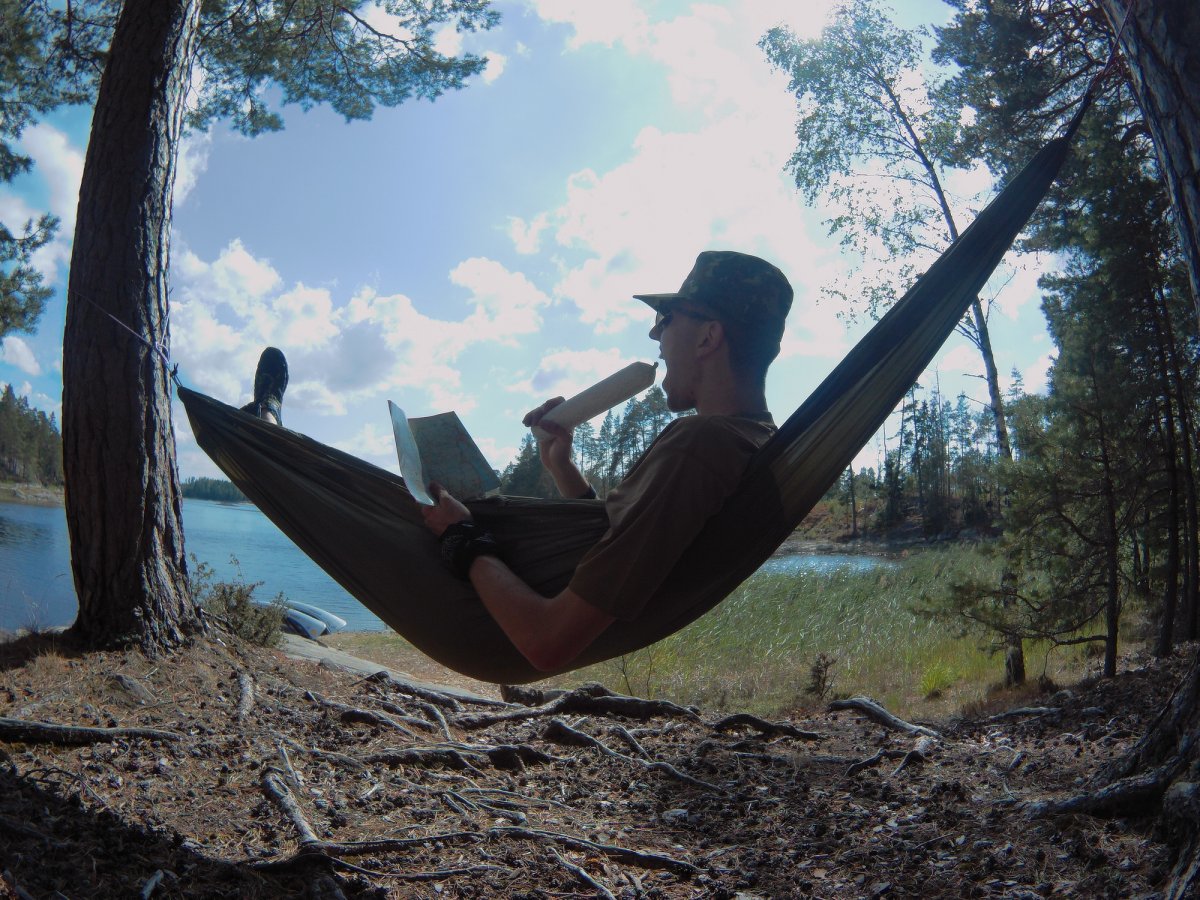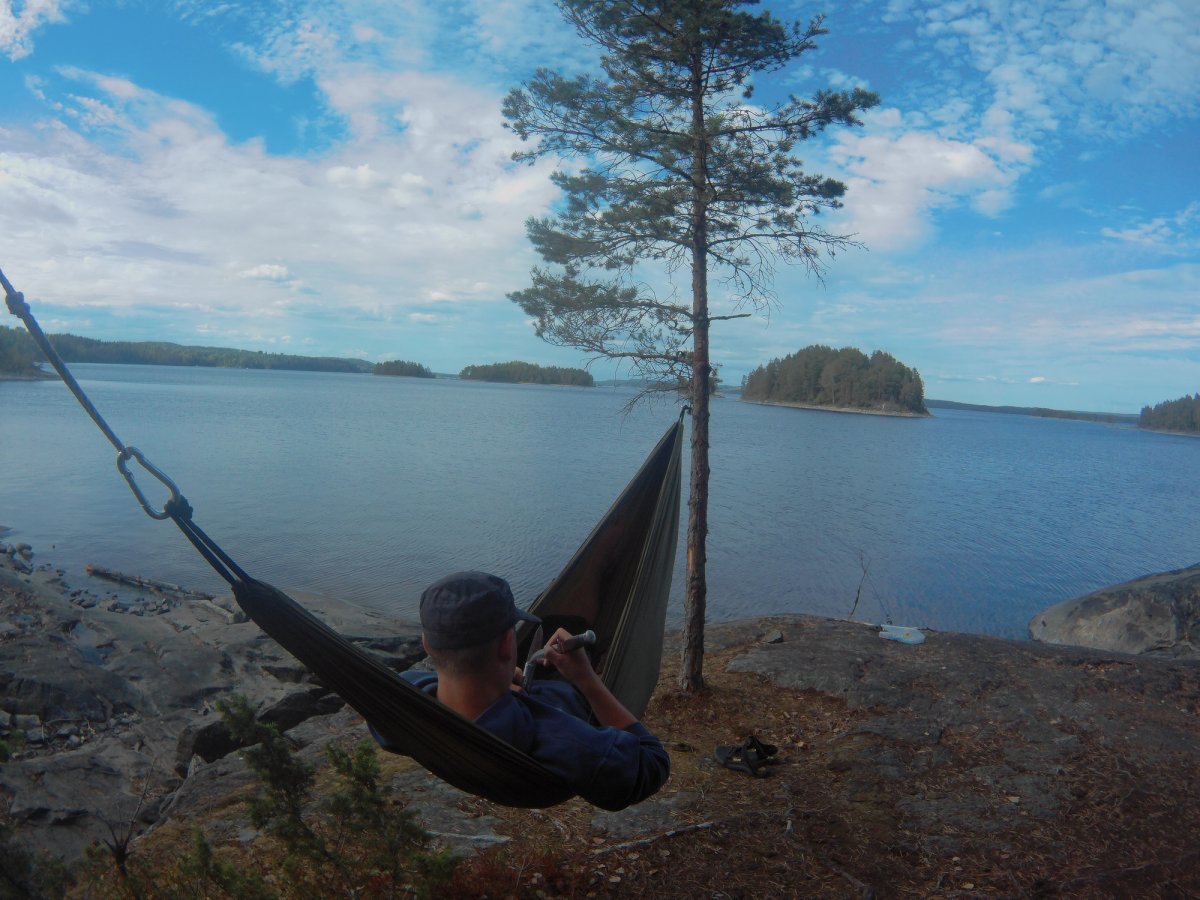 29.07.: Ein kurzes Bad zum wach werden, dann gab es zum Frühstück einen kalten Sturzkaffee und Eiweißbrot. Wir hatten sehr viel Eiweißbrot. (Aufgrund des Kochverbotes hatten wir uns im Camp als Tausch gegen Nudeln extra Brot geholt…) Dann ging es weiter Richtung Nordosten. Das Ziel: “Lilla Sundsbyn“. Aber auch an diesem Tag kamen wir nicht weit, das jedoch war der Location geschuldet. Ein eigener Kiesstrand, eine Bucht, zwischen den Bäumen direkt am Wasser versteckt, das Lager und dahinter auf einer Anhöhe die Zelte. Den restlichen Tag haben wir erfolgreich nichts gemacht. Interessant wurde es am Abend…Fredis Plan: in der Hängematte übernachten. Mein Plan: Im Kanu übernachten. Gesagt getan. Lange haben wir es jedoch draußen unter dem klaren Nachthimmel nicht ausgehalten und beendeten die Nacht im Zelt.