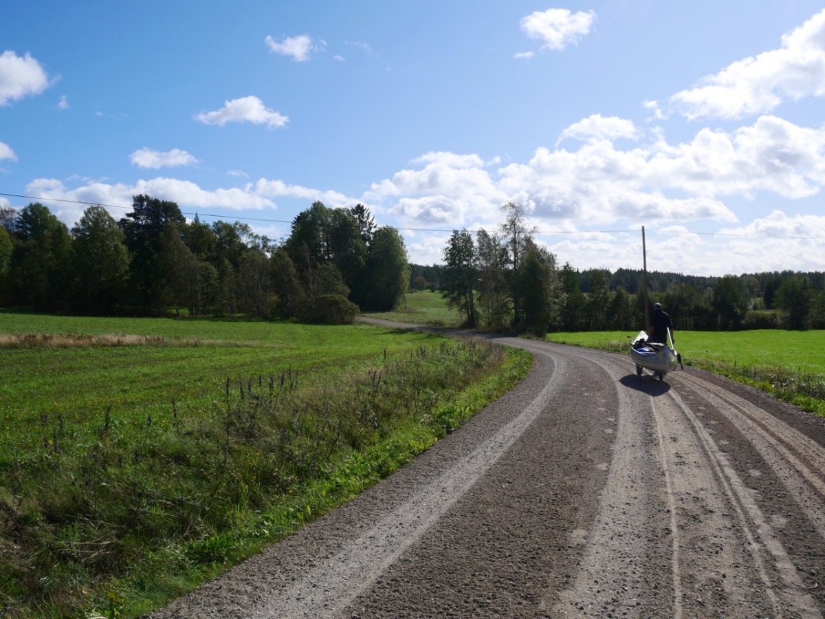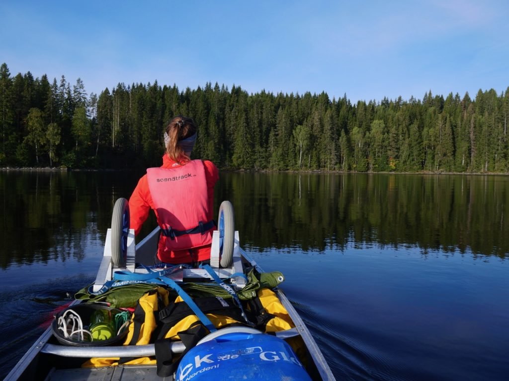 Im Camp bekamen wir auch unsere Ausrüstung: Kanu, Paddel, Versorgungstonne, weitere Utensilien wie Packsäcke, Klappspaten, Toilettepapier, Axt, Säge, Messer, Brettchen, Seil, Tarp etc. Natürlich waren auch Zelt und Kocher dabei, da hatten wir aber unsere eigenen Sachen dabei, so dass die von Scandtrack eine Woche im Auto blieben. Wir haben uns noch einen Kanuwagen ausgeliehen, so dass das Umtragen des Kanus angenehmer ist.