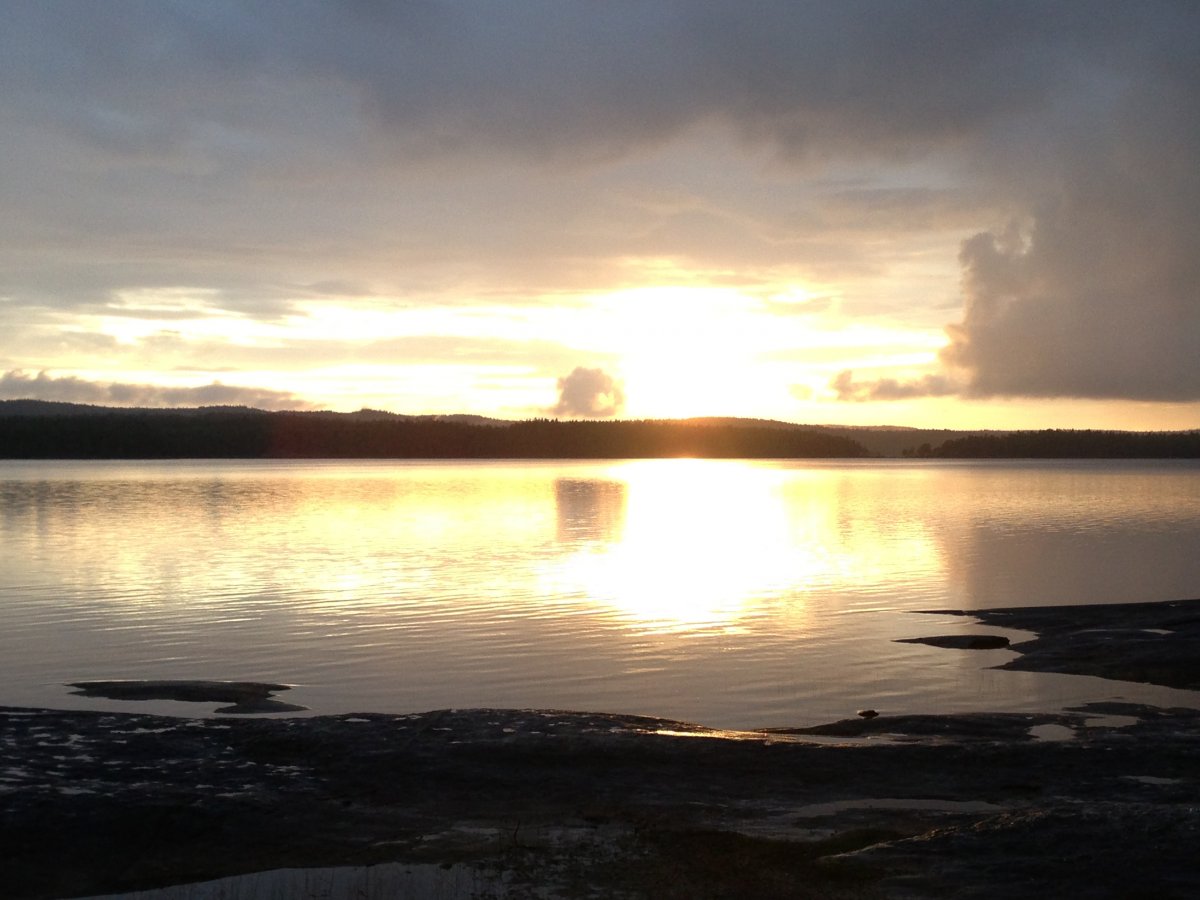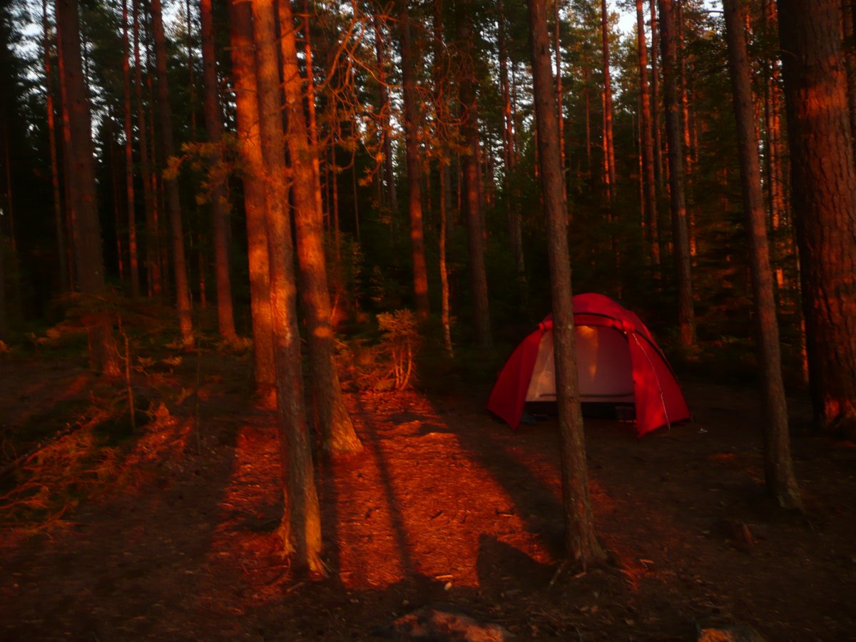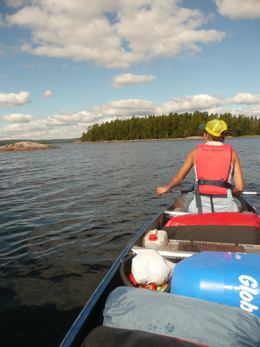 Wir sind also von Berlin aus mit dem Bus gestartet und waren am nächsten Morgen nach einer langen Fahrt, mit zwei Fährfarten, am Scandtracklager. Nach einem kurzen Frühstück, Hot Dogs und Getränk, ging es mit Sach und Pack durch den Wald zum Einchecken, Umpacken und Ausrüstung abholen. Nachdem das alles erledigt war schleppten wir unsere Essenstonne, Zelt, Packsäcke, Schwimmwesten usw. zur Anlegestelle der Kanus (anstrengend aber machbar für uns zwei schmale Frauen). Dort bekamen wir eine kurze Einweisung was Paddeln, Gefahren uns Sonstiges angeht. Nach dem bepacken des Kanus ging es dann auch schon los, am Anfang noch etwas unsicher im leichten zick zack. Wir folgten erst einmal den anderen Kanuten in Richtung Norden. Da wir von der Reise von Deutschland nach Schweden noch etwas angeschlagen waren, war unsere erste Strecke nich allzu lang nach einer halben Stunde schon haben wir unsere perfekte Bucht gefunden. Nach dem ersten mal Ausladen ( war noch aufregend ob wir kentern würden.. aber es ging alles wunderbar gut) und Aufstellen des Zeltes ( war gar kein Problem) haben wir den restlichen Tag erst einmal die Sonne, und schön Wetter genossen.