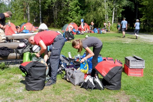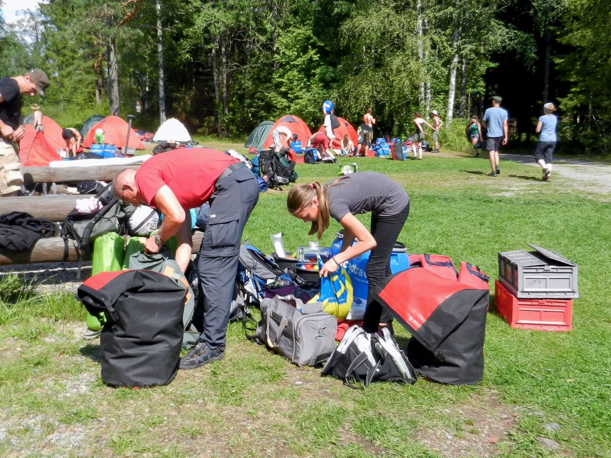 Samstag, 02.08.2014: Die Sonne lacht und macht uns den Abschied so richtig schwer. Auch der Wind ist abgeflaut. Nach dem Frühstück haben Vater und Sohn das Kochgeschirr schon mal absolut blank geputzt ( siehe Expertentipp 4 im Handbuch). Wir haben Packsäcke und Verpflegungstonnen sortiert und vor dem Abbau die Zelte gereinigt. Dann, nach einem geruhsamen Vormittag, ein letztes Mal packen und Kanus beladen. Alle fassen mit an, wie übrigens die ganzen anderen Tage auch. Wir genießen unsere letzte Paddelstrecke!